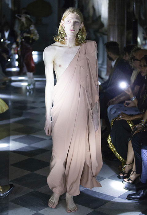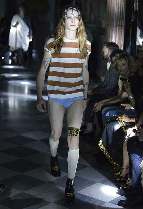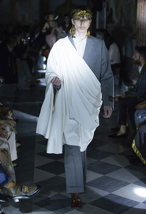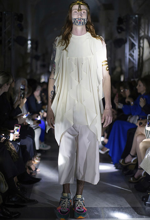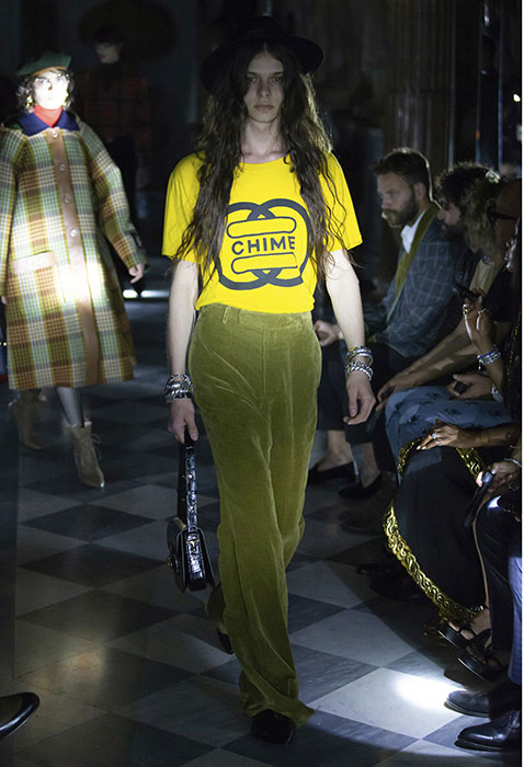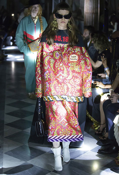 Вчера в залах римских Капитолийских музеев прошел показ круизной коллекции Gucci. Используя одни и те же приемы — микс high и low и историзмы, — креативный директор Алессандро Микеле рассказывает новые истории. Важная повестка шоу — закон в штате Алабама, практически полностью запрещающий аборты. Микеле рассказал, что часть вещей, реагирующих на новости, доделывалась за последние 24 часа до показа. Скорее всего, дизайнер говорил о вышитой пайетками матке на платье, дате 22.05.1978 (день, когда в Италии легализовали аборты) на кейпе, феминистском слогане 1970-х годов «Мое тело — мой выбор» на жакете и зататуированных ртах некоторых моделей. И не стоит считывать такой ход как желание похайпить на громком инфоповоде: с 2013 года Gucci ведет кампанию Chime for Change против гендерного неравенства. В рамках проекта марка строит женские центры, например, в Ираке и Мексике, а еще выпускает любопытный зин Chime.
