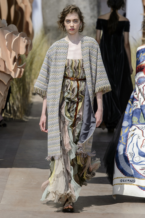 Вторая кутюрная коллекция Марии Грации Кьюри была полной противоположностью предыдущей. В этот раз кутюрный показ пришелся аккурат на 70-летие модного дома и к открытию выставки в Музее декоративного искусства, и во многом коллекция была вдохновлена страстью Кристиана Диора к путешествиям и его космополитичностью. Сама дизайнер говорит о том, что многие силуэты были заимствованы из архивов модного дома, в котором вопреки популярному мнению есть много примеров одежды для повседневной носки.