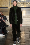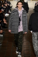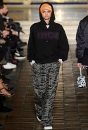 Поэтому многое здесь сегодня выглядит нелепо и, пожалуй, откровенно trashy. Но именно это, если рассматривать представленную коллекцию как итог долгих наблюдений, делает ее немного убедительнее. Хотя, если думать только о стиле, вспоминая то, что мы уже видели раньше, и оглядываясь вокруг, очевидно, что ничего нового Ванг сегодня не открыл, воспользовавшись довольно устоявшимися сочетаниями. Глубокого погружения не было — дизайнер и его команда просто собрали то, что уже было под ногами и чем до них воспользовались многие и многие дизайнеры. Вот, пожалуйста: ошейники-чокеры, камуфляжные штаны, тонкие девичьи ножки в полупрозрачных черных колготках и тяжелых ботинках, растянутые махровые свитера, нижнее белье на выход, чуть удлиненные майки вместо платьев, огромные куртки и пиджаки — все это совсем не ново. Как и сама концепция того, что все может быть настолько плохо, что уже становится хорошо. И как идея приносить этот bad taste в роскошные церковные интерьеры.