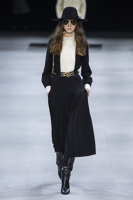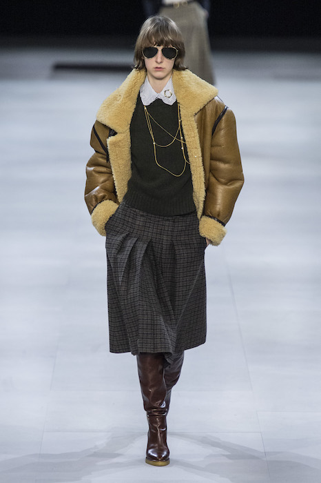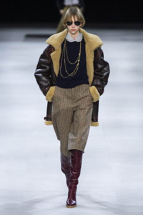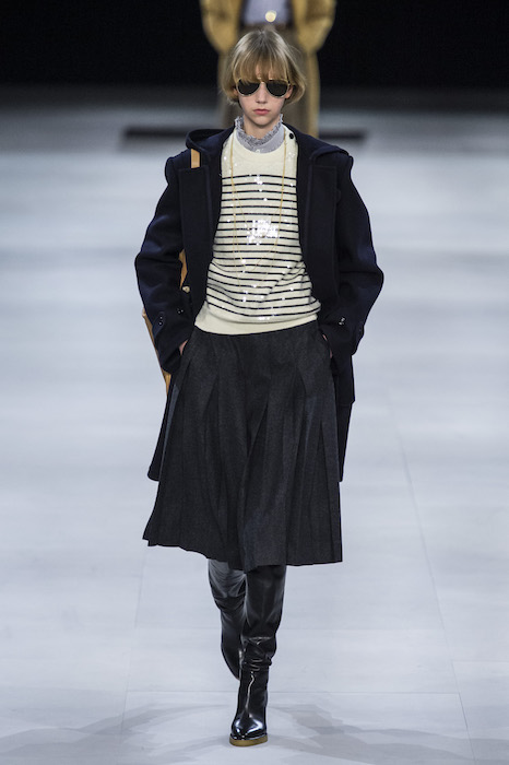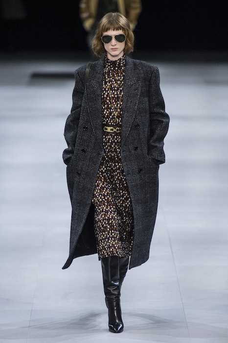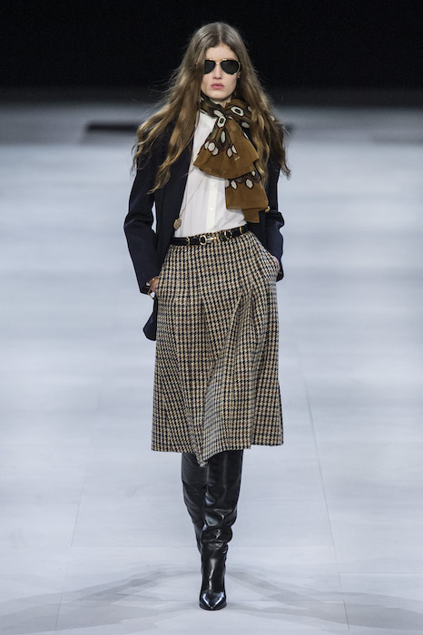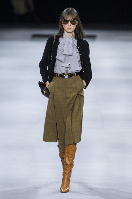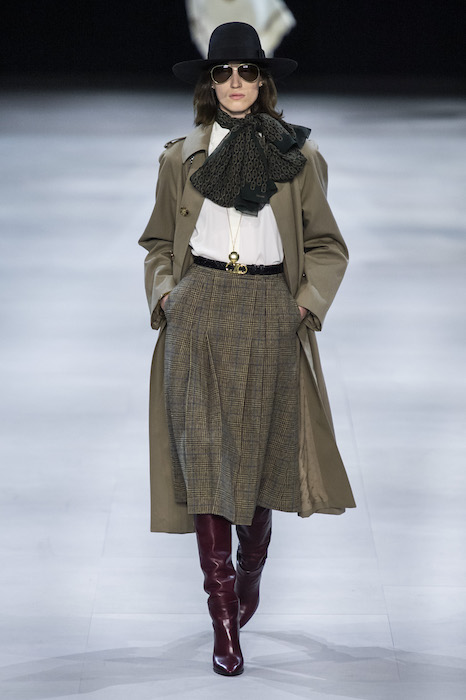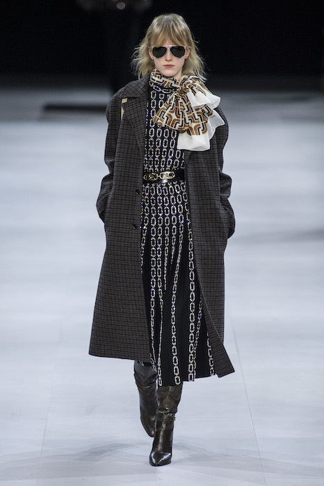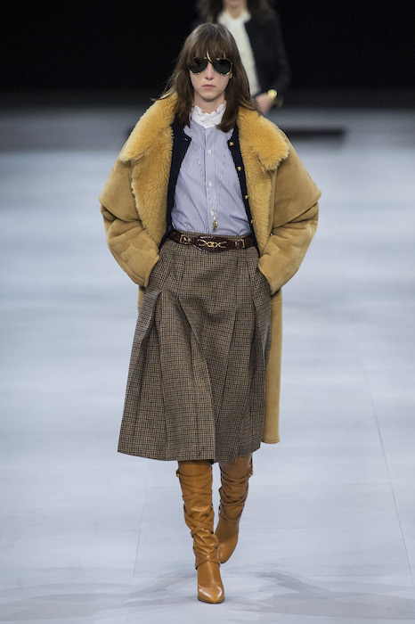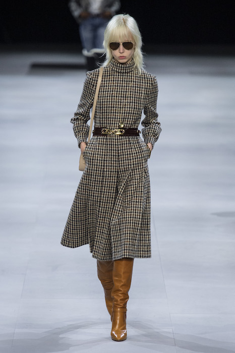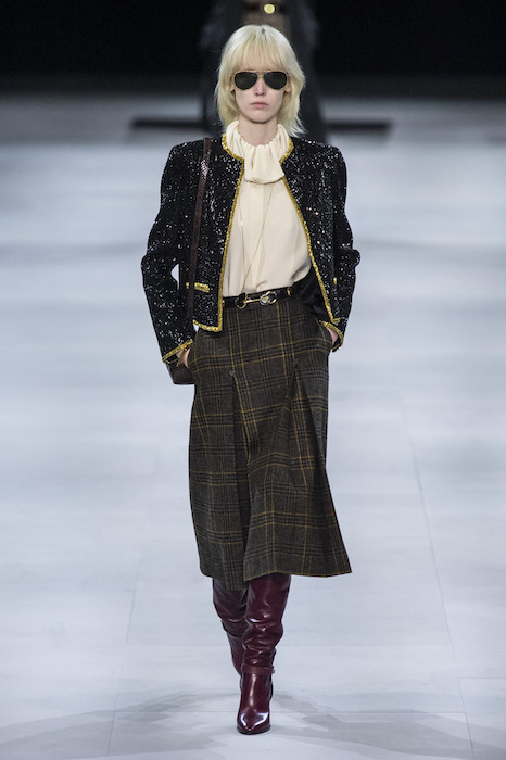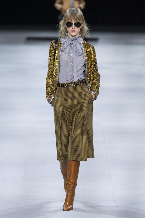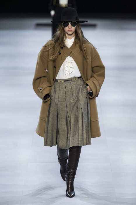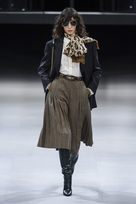 Эди Слиман не оправдал ожидания тех, кто снова планировал увидеть десятки переливающихся мини-платьев. Дизайнер вспомнил эстетику старого Celine до эпох Майкла Корса и Фиби Файло. В коллекции были плиссированные клетчатые миди-юбки, шёлковые блузки, пончо и шерстяные костюмы — как будто специально для тех, кто упрекал дизайнер в неуважении к традициям дома Celine.