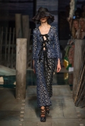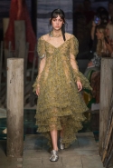 Узнаваемый почерк дизайнера — цветочные принты, которые есть в каждой коллекции. Мелкий, как на винтажных ситцах, цветочек украсил километры тонкого шелка — для платьев в пол, нежных турнюров и объемных юбок материала не пожалели. Та же история с кружевом — из него сшили платья с завышенной линией талии, как на исторических портретах эпохи. Приглушенная цветовая палитра изредка окрашивалась вспышками песочного и алого, довершая меланхолическое настроение коллекции.