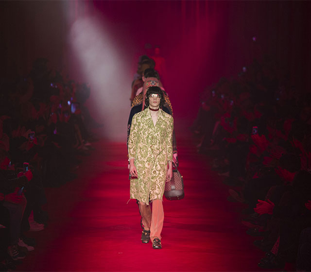 На самом деле довольно трудно сказать, какая это по счету коллекция Алессандро Микеле — вау-эффект, произведенный его первым появлением в свете софитов, уже прошел, а новый стиль марки с тех пор больше не менялся. Из коллекции в коллекцию с незначительными изменениями кочуют все главные фишки, появившиеся еще на дебютном показе. И образы главных героев, заданные еще тогда, остаются почти неизменными: вместо взрослых мужчин и женщин, сексапила и кожи — мальчики и девочки, гики и книжные черви, бабушкины береты и фантазии о приключениях, переродившиеся в красивых сюжетных вышивках. Эди Слимана за такую же преданность своим идеалам каждый сезон почти проклинают, но Микеле по-прежнему остается общим героем, хотя Gucci он встряхнул так же резко, как его коллега поступил с Saint Laurent. Но романтичный настрой креативного директора итальянского дома публике пришелся по душе больше. И итогом его работы стал не только рост продаж (Слиман и вовсе поднял продажи едва ли не вдвое), но и всеобщая любовь. Хотя на первую его коллекцию реакция тоже была противоречивой — уж слишком неожиданными оказались юноши с бантами на шеях и в кружевах.