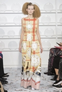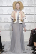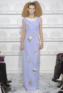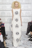 Как и сама основательница дома, его новый креативный директор (это вторая коллекция Гийона для Schiaparelli) тоже увлекся сюрреализмом. Правда, проявилось это увлечение не в поиске новых форм и их использовании, а только в принтах или узорах, нанесенных другими способами, — зато принтов здесь множество. Начинается все с платья, раскрашенного под скатерть с расставленными по столу тарелками, а потом мотивом для рисунков становится то, что в этих тарелках могло бы находиться. Лук, маленькие тыквы, пучки моркови, помидоры, кочаны капусты, лимоны, еще не снятые с веток, — таким неожиданным образом дизайнер решил выразить свое уважение Гале Дали, жене и музе знаменитого художника. Это отсылка к проиллюстрированной Сальвадором Дали кулинарной книге Les Dîners de Gala и, пожалуй, идеальное воплощение идеи Гийона — находить экстраординарное в повседневном. Сюда же можно отнести и голубые репы, разбросанные по белому платью в пол, и такой же вечерний наряд, только украшенный орнаментом из чайных ложек.