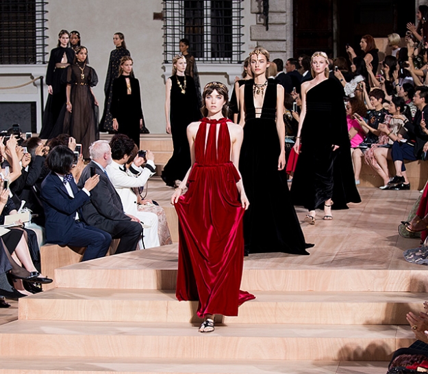 Судя по тому, какой насыщенной получилась коллекция, по родному городу и Мария Грация Кьюри, и Пьерпаоло Пиччоли в постоянных разъездах успели по-настоящему соскучиться. Именно здесь, по их словам, они постоянно заряжаются энергией, и именно здесь им в голову приходят самые яркие идеи. Даже не будучи уроженцем Вечного города, понять их легко: история Рима уходит так глубоко в прошлое, что, оказавшись в нем, чувствуешь единение со всеми людьми, когда-либо жившими и творившими здесь, — от древних римлян и до наших современников. Пиччоли и Кьюри на этот раз решили углубиться как раз в историю и добрались до самого Древнего Рима — так появились здесь платья-тоги, графичные орнаменты, массивные золотые украшения и шитье, напоминающие россыпи старинных монет, найденные в раскопках, а также образы животных, во всех легендах символизирующие силу, мудрость и власть.