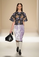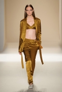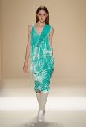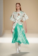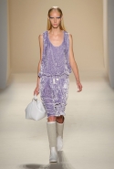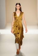 Первое — это бархат. Выбрав светлые тона, от пастельно-лилового до шербетно-оранжевого и мятного, и добавив к ним васильковые и золотые оттенки, Виктория представила весеннее прочтение этого традиционно зимнего материала в череде платьев, юбок и брючных костюмов с драпировками.
