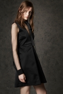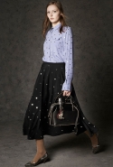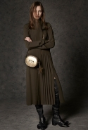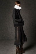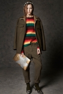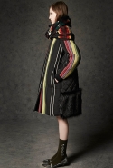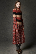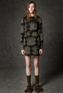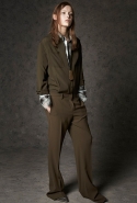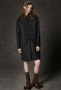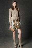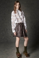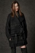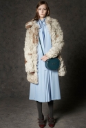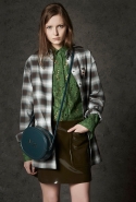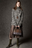 Где-то посередине, между этими двумя полюсами прячутся и другие грани, но именно так обозначенный контраст, конечно, выглядит наиболее показательным. Девушка в вязаном свитере с кошкой против девушки в костюме цвета хаки. Мини с пайетками и перьями, длинные платья с оборками, а рядом кожаные вещи и платья, перешитые из огромных клетчатых рубах. Кружевные блузы и платья против грубых свитеров и шерстяных пальто, их окружающих (тот же ход недавно использовал Кристофер Бейли для Burberry, но в его версии почти все кружева достались мужчинам). Это столкновение двух полюсов можно обнаружить даже в одной вещи — особенно показательной выходит верхняя одежда, суровые по силуэту пальто с массивными плечами, выполненные к тому же в темных тонах, но с отделкой из лент в тон. Они могут лежать на груди, напоминая золотые канты на гусарском мундире, могут висеть ровной бахромой, а могут становиться бантами.