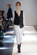 Очевидно, справившись с волнением, Себастьен Мюнье представил крайне уверенную и самодостаточную коллекцию, построенную исключительно на сочетании черного и белого. Они представлены на подиуме примерно в равных пропорциях, но выходы разных цветов не чередуются между собой: он оба цвета сталкивает в одном наряде, собирая свои многослойные замысловатые вещи из крупных монохромных блоков. Половина темной жилетки густо расшита серебристой тонкой нитью, вторая не тронута; из-под нее высвобождается длинное светлое платье, поверх нее белеет просторная белая рубашка, а ноги, утянутые узкими черными брюками, украшают такие же двухцветные сапожки.