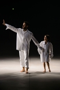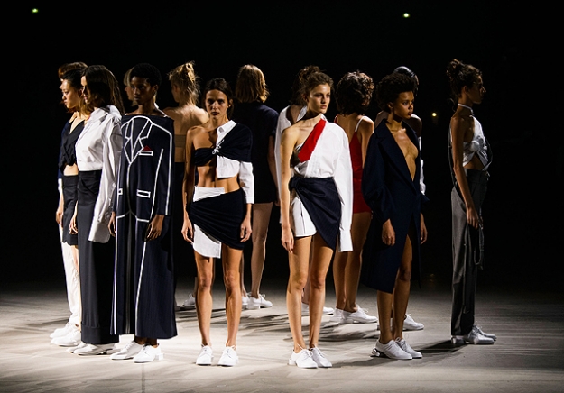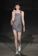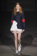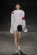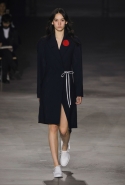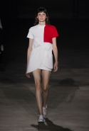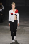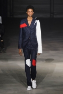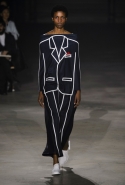 На этот раз все выглядело сырым и будто сделанным наспех: водолазки без рукавов, натянутые на модель поверх ее рук, не к месту прицепленные галстуки, покосившиеся пиджаки, не слишком старательно переделанные в платья, косо и криво сшитые платья-комбинации. И даже чистые простые краски, которые использует Жакмюс, темно-синий и красный, белый и черный, положения не исправляют: прежней жизнерадостности здесь нет. Если раньше та же недоделанность, очевидная асимметрия казались имитацией очаровательной безалаберности и беспечности юности, то сейчас дизайнер, кажется, говорит о тоске, когда будущее неопределенно и все валится из рук. Исчезает это ощущение только тогда, когда на подиуме появляется наш любимец Сол Госс в костюме, просто нарисованном белой краской поверх темно-синей робы в тонкую-тонкую полоску. Особенно иронично выглядит красный треугольник, в рисунке играющий роль носового платка, по-джентльменски хранимого в кармашке на груди.