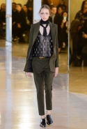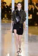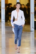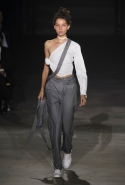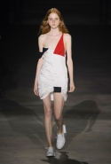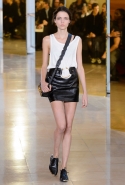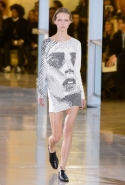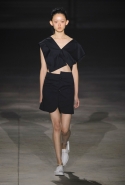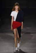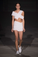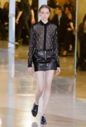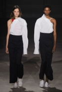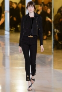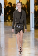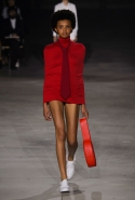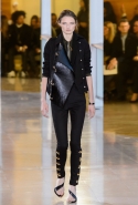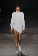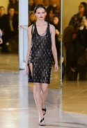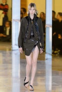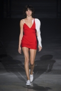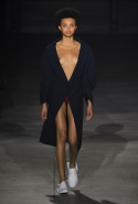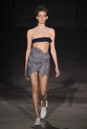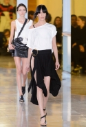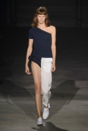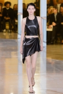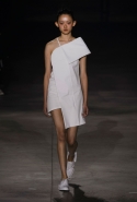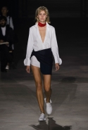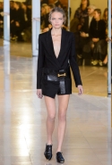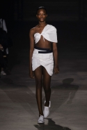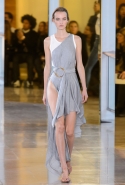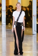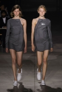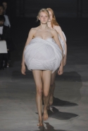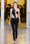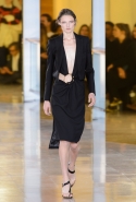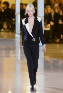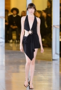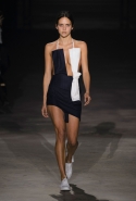 Главными звездами коллекции, безусловно, стали именно те самые асимметричные юбки, не просто демонстрирующие миру нижнее белье моделей, но и делающие его своей частью. Держались на теле они, кажется, только благодаря крупным металлическим кольцам, на которые и были собраны мелкие складки драпировок. Эти же кольца собирали воедино и разрезанные надвое (то есть на топы и юбки) черные платья. Запомнилось нам и то, как Ваккарелло обыграл пиджаки, превратив их в такие же сексуальные мини-комбинезоны.