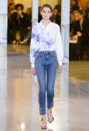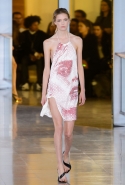 Энтони Ваккарелло, протеже Донателлы Версаче, любит человеческую кожу больше любых других материалов. Пусть такое описание не пугает вас: просто тело в его коллекциях играет не меньшую роль, чем надетая на него одежда. И то, что добрая половина образов из показанной сегодня коллекции была проникнута милитари-эстетикой, ничуть не помешало ему вновь красиво раздеть моделей. Вырезы на юбках на этот раз были еще опаснее, чем обычно, и точно выиграли битву за зрительское внимание и у военных жакетов, и у длинных брюк с джинсами, и у платьев с нарисованными точками женскими портретами. Те, впрочем, дух коллекции передавали прекрасно: чуть приоткрытые пухлые губы, томный взгляд густо накрашенных глаз — sex sells, и мы все это знаем.