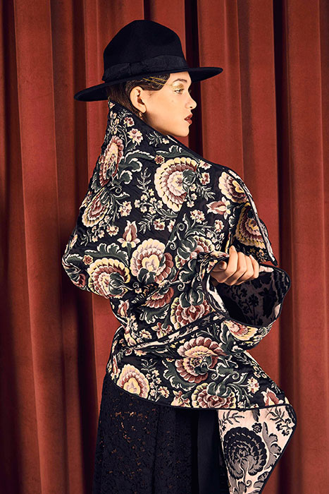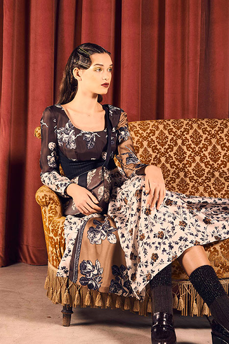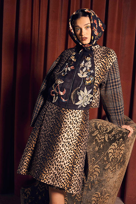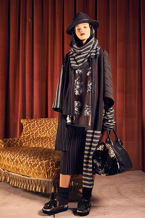 Стилистика лукбука выдержана соответствующая: леопардовый принт на одежде и обуви, много кружева, бархата и мех. Прически и мейк-ап выполнены в стиле 60-х. Аксессуары тоже с приставкой ретро: фетровые шляпы, длинные перчатки и косынки (цветочные или совсем китчевые — из пластика). Цветовая палитра — в темных оттенках коричневого, серого и золотого.