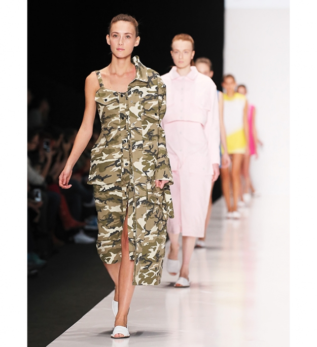 Рабочие халаты, обшитые крупными, "вассермановскими" карманами, и глухие платья-рубашки, которые вполне могли бы принадлежать ученым из фильмов 80-х годов, совсем не похожи на униформу работников оборонной промышленности и даже вирусологов. Поэтому и раскрашены они в самые яркие цвета, которые в коридорах любого другого НИИ казались бы совершенно чужеродными: это и небесно-голубой, и беззаботно-розовый, и желтый, и удивительно жизнерадостная камуфляжная раскраска. Под вывеской Cap America объединилась воображаемая команда ученых-художников. За своими рабочими столами (а может быть, и мольбертами) они создают новые ткани, имитирующие текстуру бумаги, и синтезируют цвета. Здесь проводятся эксперименты не с животными, а с палитрами — и на платьях появляются градиентные разводы, создающие на плоскости иллюзию объема.