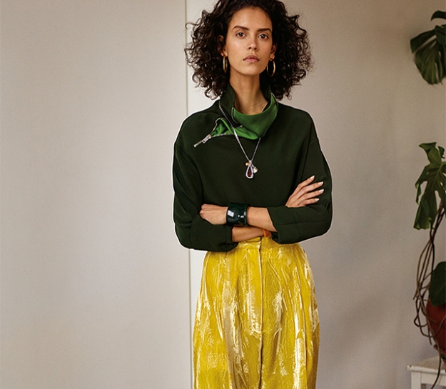 Все спокойно, плавно и хорошо. При этом традиционной песчано-коричневой гаммой дизайнер не ограничивается, разбавляя ее фуксией, желтым, терракотовым, бордовым, красным, зеленым — цветов на самом деле удивительно много, но никакого ощущения «светофора» их обилие не вызывает. Каждый цвет Файло использует в монохромных, но при этом многослойных образах. Каждое из показанных платьев надето, например, непременно поверх брюк — широких и мешковатых, почти волочащихся по полу, или широких и подвернутых, или идеально прямых с идеально отглаженными стрелками.