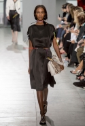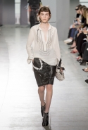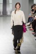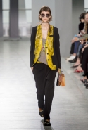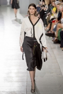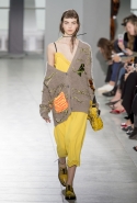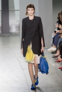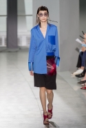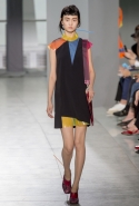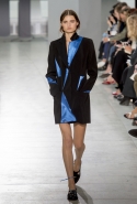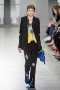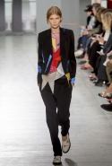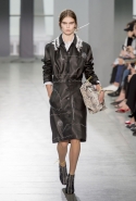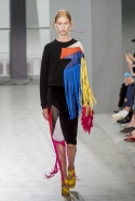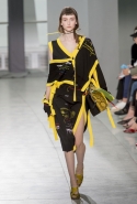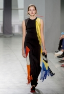 И здесь можно было бы заговорить о еще одной коллекции, в какой-то степени продолжающей увлечение DIY, замеченное нами на подиумах Нью-Йорка, если бы Кейн вовремя не подключил и другие приемы. В некоторые платья он, например, вживляет пластины цветного прозрачного пластика. Другие, черные асимметричные платья, кажется, обрызганы кислотой: потому что плотную ткань прорывают яркие, кислотно-красочные пятна. Они справляются не только с тканью, но и с более плотной кожей, появляясь в том числе на кожаных косухе и юбке.