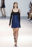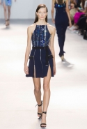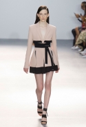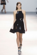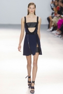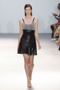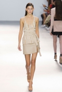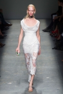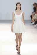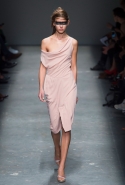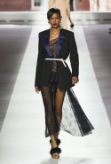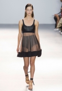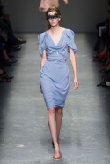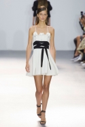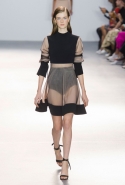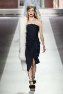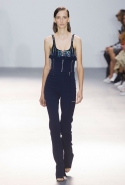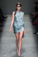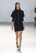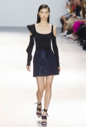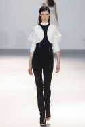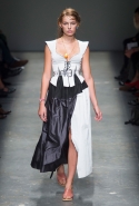 Вместо платьев-перчаток с геометричными вырезами тут и там Давид Кома решил на этот раз представить большее разнообразие силуэтов. У некоторых платьев появились коротенькие пышные юбки, другие стали похожи на удлиненные олимпийки с атласными рукавами-буфами. Но все-таки тело в коллекции грузинского дизайнера по-прежнему остается на первом месте: именно ему он уделяет все свое внимание, то демонстрируя беззащитную кожу все в тех же резких вырезах, то утягивая талии рядами ремней, то вставляя в те самые кукольные baby doll прозрачные детали.