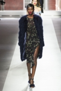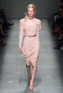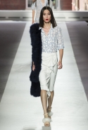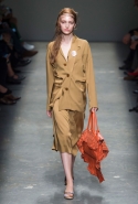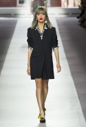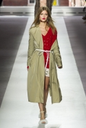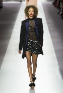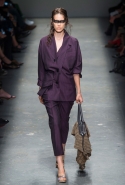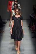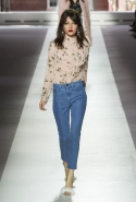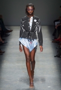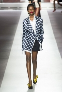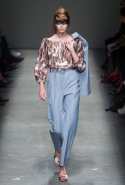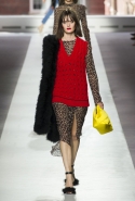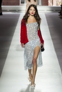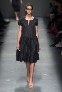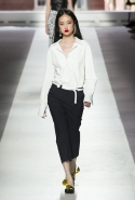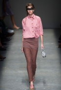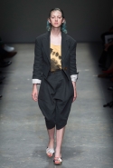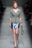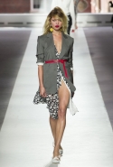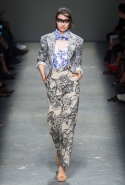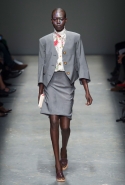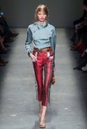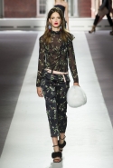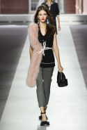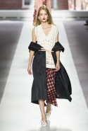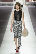 Вся коллекция MM6 Maison Margiela собрана из вещей категории «найденный объект», то есть каждый предмет в ней выглядит так, как будто был принесен кем-то из команды дома с барахолки. А потом из всех своих находок дизайнеры в случайном порядке и собрали представленные образы. И это совсем не недостаток: если убрать еще и детали, сделанные из целлофановых мешков, которые одним своим присутствием всегда превращают все в выпуск Project Runway, все будет и вовсе здорово. Некоторые сочетания и неожиданные идеи радуют особенно. Например, интересно выглядит набедренная сумка, надетая вместо топа бандо, смешной и очень в духе неудачных показов Rodarte — толстовка с лошадиным принтом, перевязанная расшитым серебристыми пайетками полотном. Нашлось здесь место и неизбежным ретроплатьям, которые на этот раз идут в паре с куцей вязаной жилеткой, и «вареным» футболкам.