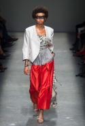 Но признаться в любви хочется не традиционным корсетным платьям, «дедушкиным» узорчатым пиджакам и бандажам из лент, а одним великолепным, очень широким серо-красным брюкам. Именно они неожиданно для всех стали главной звездой показа.