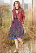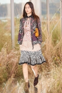На этот раз, кажется, дизайнер решил вспомнить о девушках из пригородов — тех самых, которые в школу идут через бескрайние поля, а на досуге любят красиво лежать в траве, красиво раскинув усыпанные цветами юбки. Они носят большие куртки с ситцевыми платьицами в цветочек, непритязательные костюмы и юбки с простыми свитерками. А на свитерах — вполне возможно, с любовью связанных их мамами и бабушками - часто красуются детально вывязанные картинки со страниц журналов по рукоделию, которые привозит к ним домой сельский почтальон.