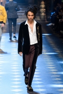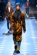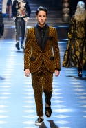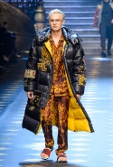 Основные элементы: мужские костюмы и смокинги из царственной парчи, золоченые ткани и военные мундиры, свитера с принтом, объемные пэчворк-пуховики против длинных пальто, стеганые бархатные домашние халаты