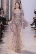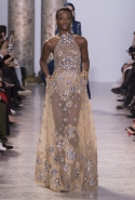 Основные элементы: длинные платья из атласа, шелка и органзы, золотые украшения и аппликации как структурирующий элемент, стройные силуэты при использовании свободной и прозрачной ткани