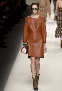 Одним из главных материалов в новом сезоне, помимо традиционного для Fendi меха, стала кожа. Из нее команда Fendi сшила и стоящие колоколом платья-рубашки, и топы, и сарафаны, которые кажутся больше похожими на технические чертежи, чем на вещи, которые в принципе могут поступить в магазины, — даже карман на груди кажется не настоящим, а только чуть намеченным. Еще интереснее смотрятся кожаные юбки и кюлоты с нашитыми по бокам огромными прямоугольными панелями.