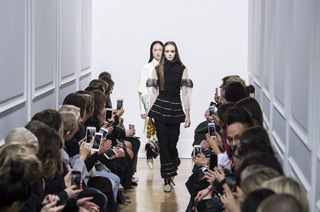 Главным приемом, с которым работает дизайнер, снова становится радикальный объем. Но в этот раз Андерсон не ограничивается, как в S/S 2016, одними пышными рукавами — округлые пышные формы приобретает все. Особенно трогательно это выглядит, когда он отходит от любимых широких брюк и берется за те самые коктейльные вещи, костюмы из просторных топов и пышных юбок, собранных из пухлых сборенных тканей, скрученных так, что получаются из них не просто юбки, а цветочные бутоны. Мотив розы появляется и в более буквальном выражении, в виде принта на такой же мягкой, прошитой наружными стежками толстовке. А сами девушки превращаются в воздушные шарики (облака, шапки сахарной ваты — уместным будет любое сравнение), вышагивающие по подиуму на тонких ножках.