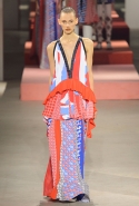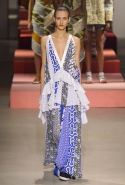 Купальники в большинстве случаев заменили девушкам Kenzo топы, а иногда, видимо, в особенно жаркие дни, и шорты. Они же становятся основой и для множества платьев самого разного кроя и длины от мини до макси. Впрочем, носить слитные купальные костюмы, расстегнув нижние пуговицы, Леон и Лим предлагают и поверх брюк: это сочетание в новом сезоне мы видим уже не в первый раз, так что если у вас в гардеробе до сих пор нет боди, которое можно было бы надевать таким образом, предлагаем задуматься о его приобретении, пока не стало слишком поздно. Вспомнить можно и о вещах в технике пэтчворк: команда Kenzo активно представляет и ее, демонстрируя платья из кусочков пестрых тканей разных расцветок и с разными узорами. А получившееся полотно иногда приправляют и оборками — от этой пышной тенденции следующей весной не скрыться никуда.