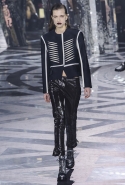 Кожи и винила в коллекции вообще очень много: одними полосками на рукавах команда Louis Vuitton себя не ограничивает. Как раз в этой группе сразу бросаются в глаза два очевидных потенциальных хита. Это, во-первых, укороченные косухи с очень объемными плечами и рукавами, и, во-вторых, лаковые брюки — самыми жгучими выглядят, конечно, красные. А заодно нашлась и другая вещь сезона, в которой наверняка часто будут появляться на публике поклонницы дома и подруги Николя Жескьера, но которая практически никому из них не будет идти. Это, конечно, кожаный (есть он и в тканевой вариации) жакет с невероятно узкой талией и очень жесткой «стойкой» снизу, как будто оставляющей пространство для более пышных бедер.