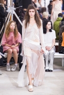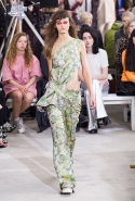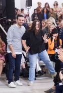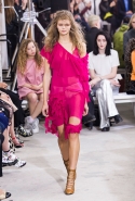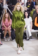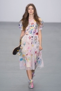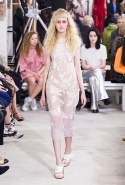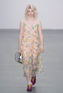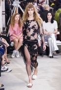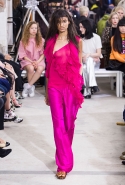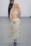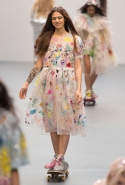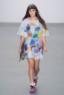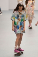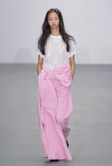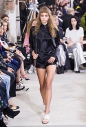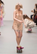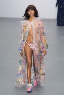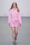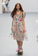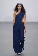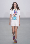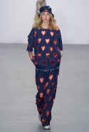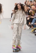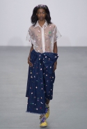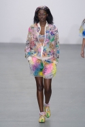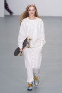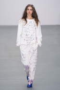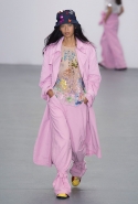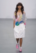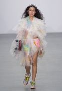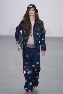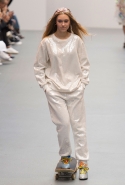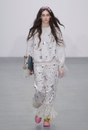 Коллекцию Ashish уже успели растащить на цитаты, и фото с подиума с завидной регулярностью появляются на страницах наших друзей с подписями «А вот так мы с N пойдем на работу» и «А это мы на корпоративе». Самого Ашиша Гупту такое развитие событий вряд ли расстроило: насколько мы помним по нашей с ним встрече (и как видим по всем его коллекциям), с чувством юмора у дизайнера все в порядке. Главным его средством выразительности по-прежнему остаются пайетки. Ими Гупта расшивает платья и спортивные костюмы, а потом еще и сверху посыпает блестками моделей — пестрые конфетти сияют в их растрепанных волосах. На этот раз, правда, преобладают пайетки не ярких цветов и красок из радужного спектра, а, наоборот, светлые, молочного оттенка. Хотя и цветных вкраплений тоже достаточно: мелкие цветы, которыми расшиты джинсовые костюмы и полупрозрачные платья, также собраны из блесток. Но больше всего лично нам запомнились не сияющие выходы, а один-единственный костюм, от ворота до краев брючин исписанный криками о помощи: «Shut up! Shut up! Shut up!»