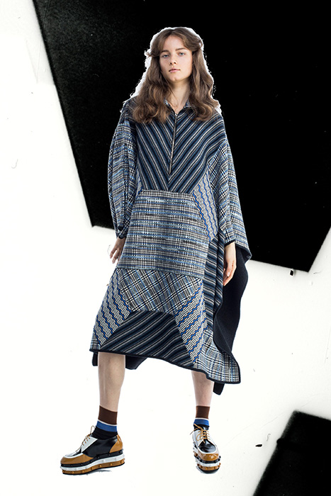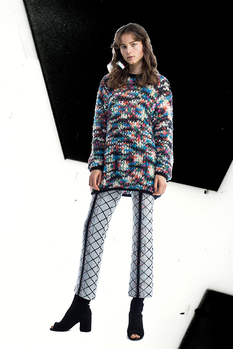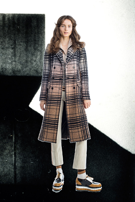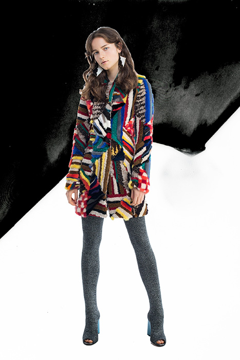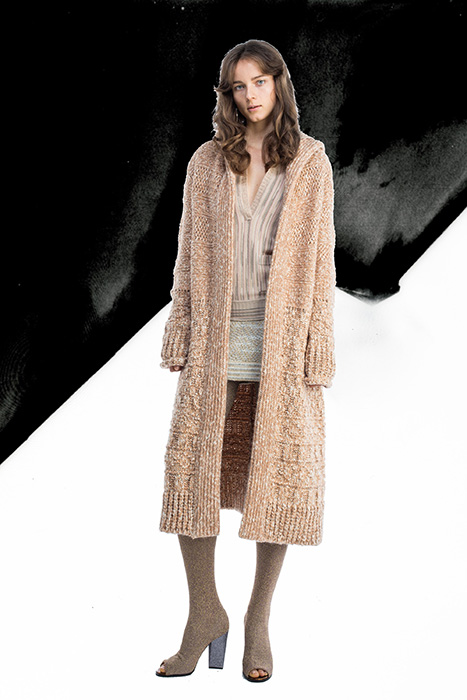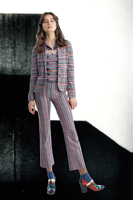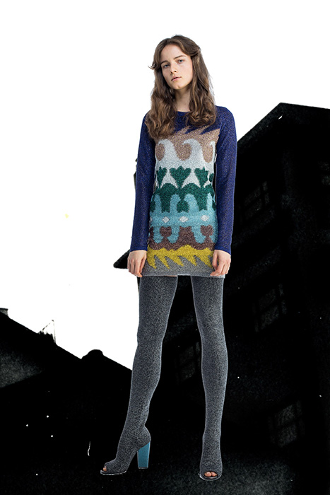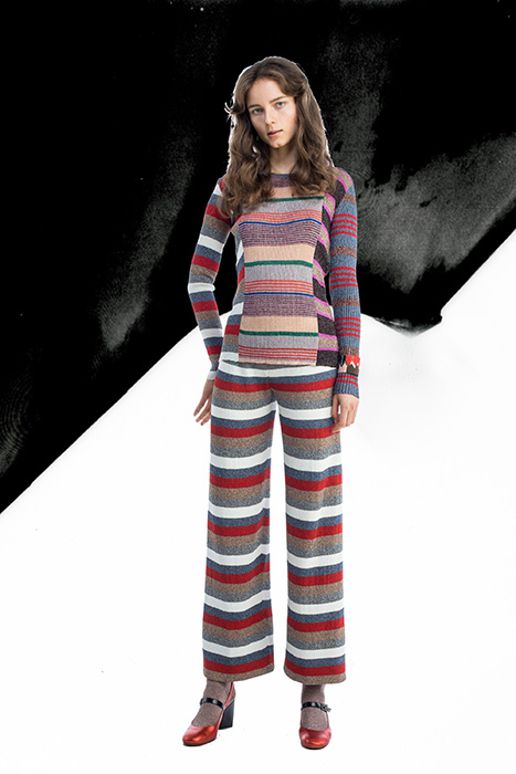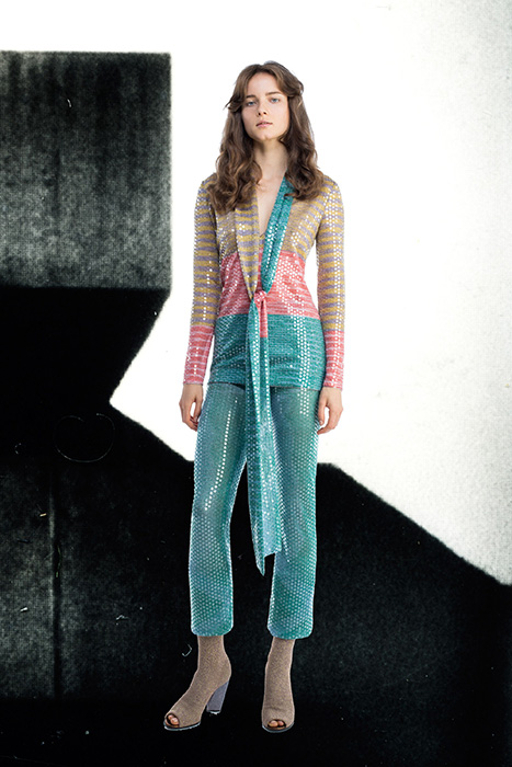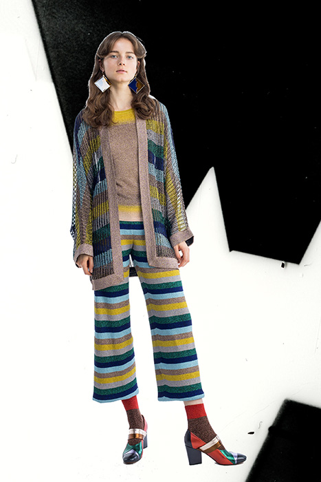 Основная идея — разделить дневную и вечернюю одежду с помощью цветов. Для дневных выходов использованы черно-белые полоски, песочные оттенки, а также серый и голубой. На вечер дизайнер предлагает много люрекса в разных цветовых комбинациях. Блестит также и графичная многоцветная обувь.
