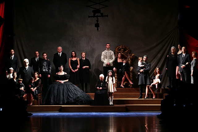 В той же черно-белой ретрогамме выдержаны и остальные вещи. Цвет появляется только во второй части коллекции, а до этого классическую скупую палитру иногда нарушают только бордовый и темно-синий. И еще, конечно, золотой, но только для фамильных гербов и витых картинных рам со старинными полотнами — это еще один из основных визуальных мотивов нового сезона Dolce & Gabbana. Но даже ограничив себя минимальным набором красок, Доменико Дольче и Стефано Габбана с легкостью поддерживают в коллекции теплую и семейную атмосферу. Цветочные принты на мужских костюмах напоминают рисунок старинных обоев, рельефные пальто с ажурными застежками похожи на домашние теплые халаты, в которых ступают по коридорам дома почтенные отцы семейств, а ближе к концу на подиум и вовсе выходит целая череда мужчин в роскошных пижамах.
