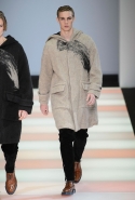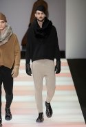 Коллекция открывается чередой мягких, почти плюшевых на вид выходов в черном цвете и теплых коричневых тонах. Большие пальто с округлыми покатыми плечами и гигантскими карманами, каждый из которых размером конкурирует с полноценной сумкой, плотные ворсистые брюки, трикотажные треники и деформированные свитера — и на всем темнеет отметка, похожая на след от валика с краской. Размашистые полосы появляются и на верхней одежде, и на брюках — в этом случае почему-то на коленках. Еще неожиданнее этот отпечаток встретить поверх клетчатой шерстяной ткани, но уже в золотом цвете.