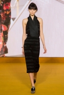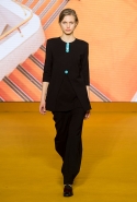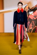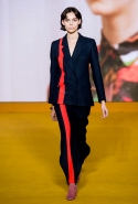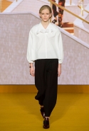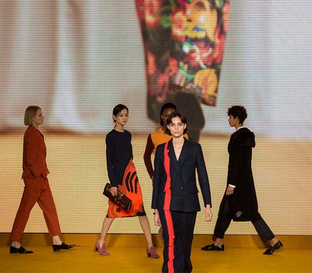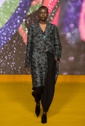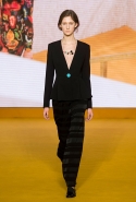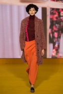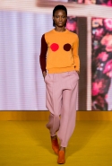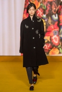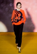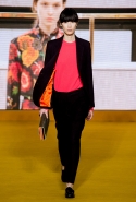 Свободная, яркая, веселая, юная — такой получилась осенне-зимняя коллекция марки. Кажется, что Пол Смит решил дать волю самым юным своим сотрудникам — или сам вспомнил собственное детство и поделки из цветной бумаги, которые непременно есть в жизни каждого счастливого ребенка. Многие наряды кажутся сделанными именно из нее: вырезанные детали, будь это нежно-розовые широкие штаны или костюм в буйных психоделических цветах, просто наклеены на лист ярко-желтого картона. И все, несмотря на достаточно объемные силуэты, из-за этого выглядит как будто двумерным. Это совсем не плохо, даже наоборот — ощущение неожиданное, но почему-то ужасно радостное (хотя как не радоваться, когда вокруг столько цвета? Решительно невозможно).