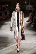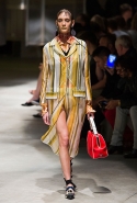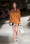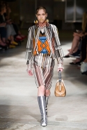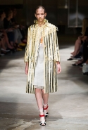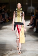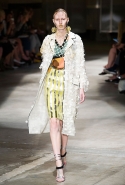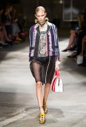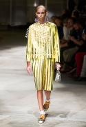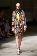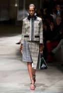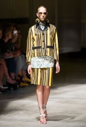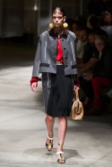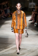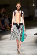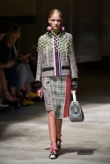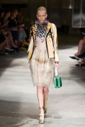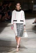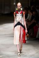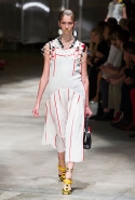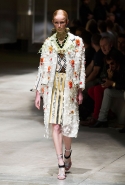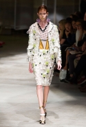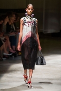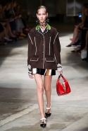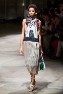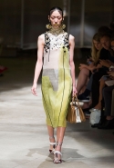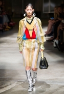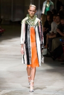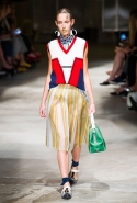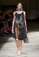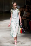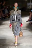 На этот раз Миучча Прада решила не пускать в ход тяжелую артиллерию в виде каких-то запоминающихся принтов, которые часто автоматически превращали каждую вещь из ее коллекций в «вещь сезона». И решила в новом сезоне стать более минималистичной, сделав ставку на простую геометрию. Конечно, без некоторых исключений дело в итоге не обошлось: на плечах порой появлялись сетки с застрявшими в них цветами, ближе к концу другие цветы, уже красные, объемно проросли на красивых белых пальто с лепестковой отделкой, а принты несколько разнообразились — и к двухцветной полоске добавились пестрые сочетания ромбов. Но в целом прямолинейность и некоторая прямоугольность, как будто отсылающая к 90-м, продолжают оставаться главными опознавательными чертами Prada S/S 2016.