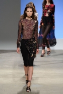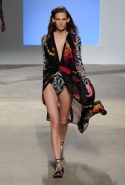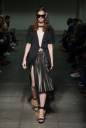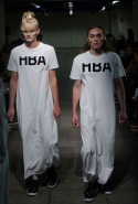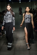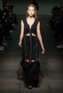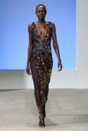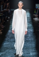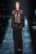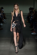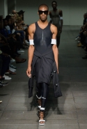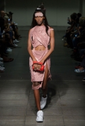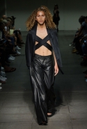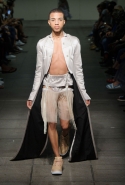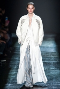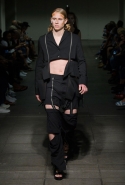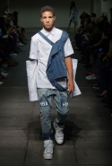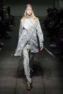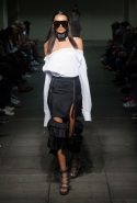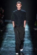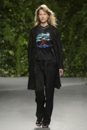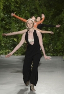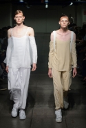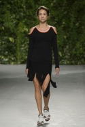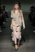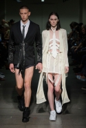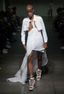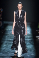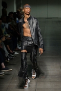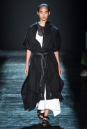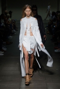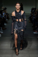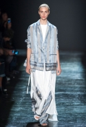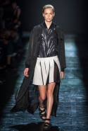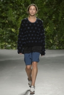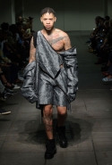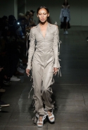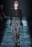 Вещи, подобные этим, обычно ассоциируются с городскими «племенами»: по таким нарядам легко сразу вычислить в толпе «своего». К тому же даже у этого городского кэжуала есть сильные визуальные связи и с этническим, племенным стилем, и с некоторой его воинственностью. Порезанные лапшой юбки, часть которых скреплены сеткой, выглядят не то по-гладиаторски, не то как у вождя племени, готового повести свою группу в бой. Подчеркивают сходство и длинные, почти в пол, плащи, развевающиеся за спинами. Продолжают тему и длинные халаты, испещренные следами зарубок и пятнами, и защитные жилеты, и узоры из крыльев, появляющиеся вдруг ближе к концу, и «ползущий» трикотаж с ритмичными узорами. А о том, что мы все-таки в современном Нью-Йорке, где борьба за выживание ведется уже другими методами, напоминают, например, пижамные штаны, выглядывающие из-под всего этого.