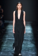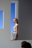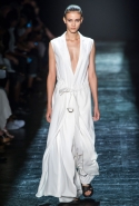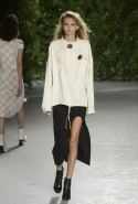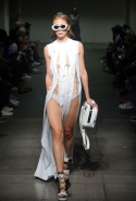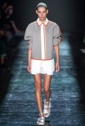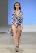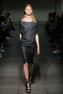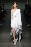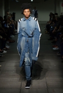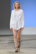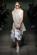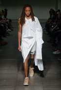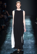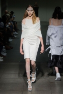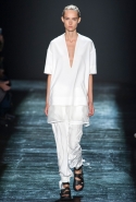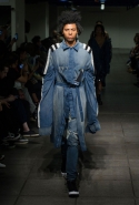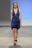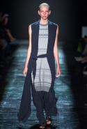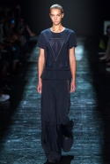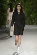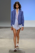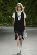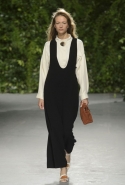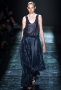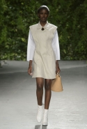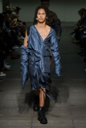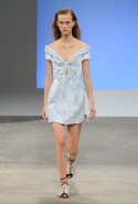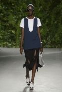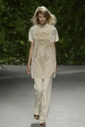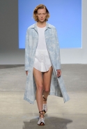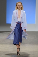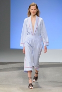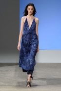 Пока же мы имеем то, что имеем. Первая часть коллекции построена в основном на «вареном» дениме разных оттенков. Что-то выглядит скучно и просто, как в масс-маркете, что-то более интересно — это касается тех случаев, когда дизайнер помимо игры с цветом добавляет еще и разницу фактур, вживляя в платья, например, рифленые полосы. Вторая часть целиком состоит из вещей пижамного стиля или же просто пижам и банных халатов, выполненных даже без особой фантазии и без лоска. В третьей же части появляется несколько красивых платьев, интересных за счет того, что блоки, из которых они составлены, заметно смещены.