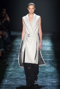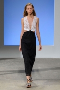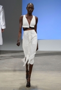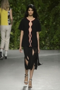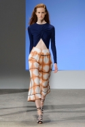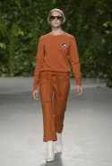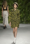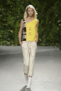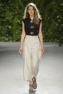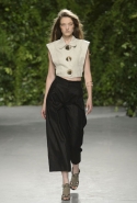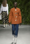 Новая коллекция Умберто Леона и Кэрол Лим вновь напомнила нам, как резкость линий может гармонично сочетаться с плавностью, а светлые, земные тона — с ярко-оранжевым и желтым. Хотя это как раз тот случай, когда слишком крупные пятна цвета кажутся скорее лишними, а уместными становятся, только если используются для расстановки акцентов. Так, например, желтая полоска может выглядеть идеально, если скрепляет ворот, не давая декольте распахнуться и стать почти неприличным. Так же хорошо выглядит и терракотовый топ, на боку у которого красуется блок ткани, расчерченный черными и желтыми линиями. А вот полностью желтое платье или оранжевая куртка с блестящими круглыми пуговицами в таком окружении уже почему-то не работают, слишком выбиваясь на общем фоне и нарушая сложившуюся гармонию.