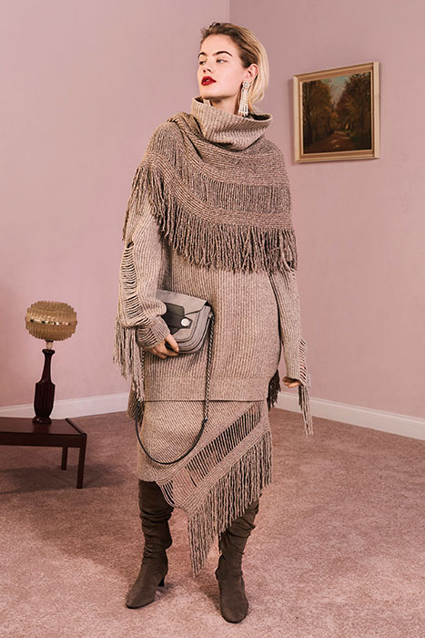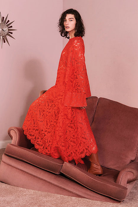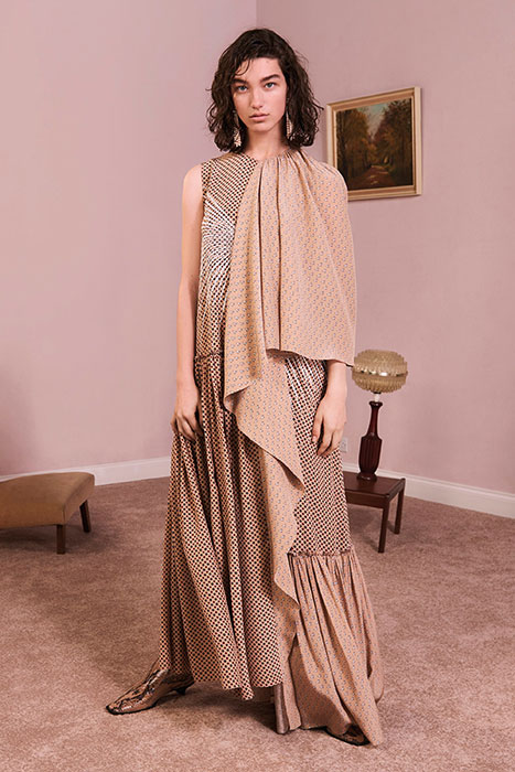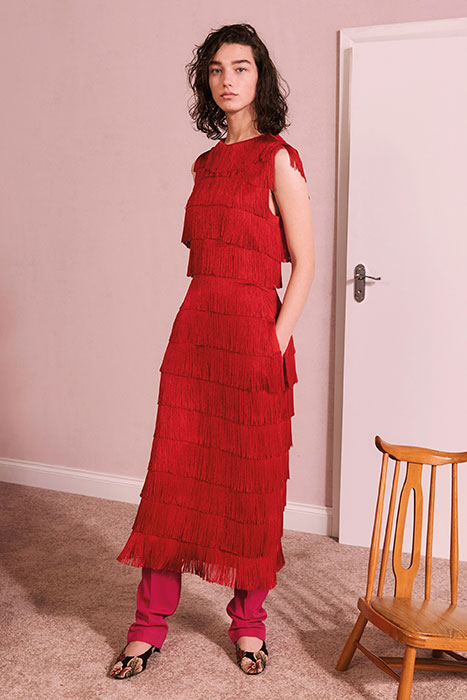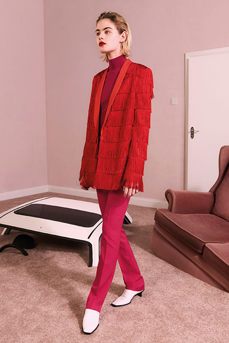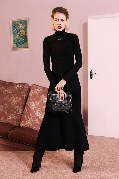 Мягкие ткани, летящая бахрома и волнообразные складки в сочетании с грубой кожей, огненно-красными луками и строгими пиджаками — новый pre-fall марки Stella McCartney. Коллекция наполнена множеством разнокалиберных деталей (сумки всех габаритов, жемчужные украшения, металлические круги на кожаном платье) и фактур (мех, трикотаж различной вязки, пайетки, кружево, деним).