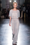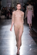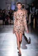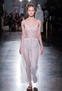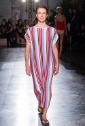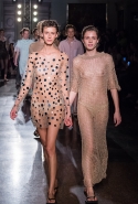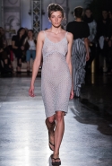 Жажда денег и приключений в этой коллекции сливается с отпускной беззаботностью. Так что пляжные вещи в полоску, которые здесь представлены во всем многообразии, от комбинезонов с широкими брючинами до длинных туник, соседствуют с совершенно другими вещами. Например, с многочисленными платьями-комбинациями. Или с ярко-красными лаковыми шортами и плащами-халатами, под которыми может что-то быть, а может и нет. Или с теми самыми платьями из сетки, некоторые из которых еще и усыпаны мелкими кружками, напоминающими монетки. Те же кружки закрывают соски модели, когда на груди у той вдруг распахивается пушистый и в остальном довольно скромный на вид кардиган. Случайность или нет? Мы, конечно, склоняемся ко второму.