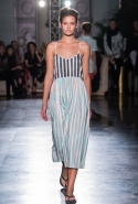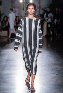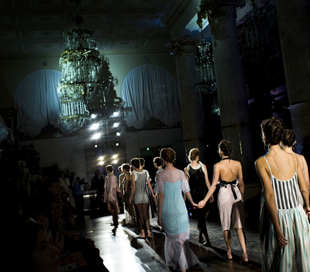 Тема морских путешествий и отпусков вполне предсказуемо стала одним из главных местных трендов российских недель мод. В вечной осени и слякоти нам жить еще долго, почти полгода, и тем приятнее смотреть на моделей, босиком или во вьетнамках гуляющих по подиумам в легких полосатых платьицах. Виктория Андреянова, Александр Терехов, а теперь и Андрей Артемов — и мы почти забываем, что на улице по-прежнему гадкий октябрь с холодом и мелким дождем. У Артемова мир, как всегда, особенный. Здесь нет капитанских мундиров или скромных девиц, ожидающих на берегу своего капитана под алыми парусами. Героини Walk of Shame свое счастье берут в собственные руки и принцев уже не ждут, а поджидают (во всеоружии!) в фойе дорогих гостиниц. В данном случае — в «Интуристе», лого которого и стало основой для сезонного логотипа марки. И пусть того странного очарования почившего московского «Интуриста» у его ялтинского тезки, несмотря на частный пляж и прочие бонусы, уже нет, история героини по-прежнему читается легко — просто реальность здесь ловко перемешивается с фантазией.