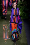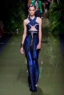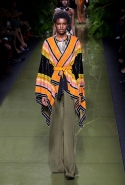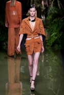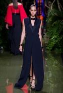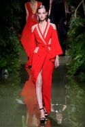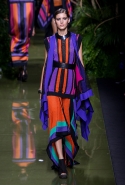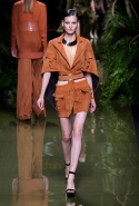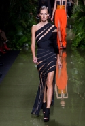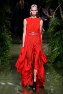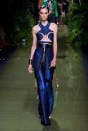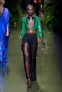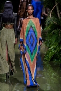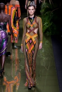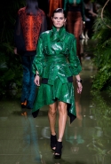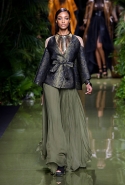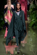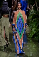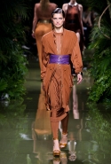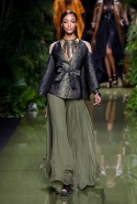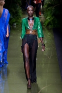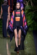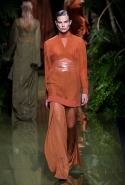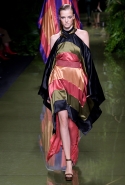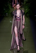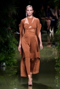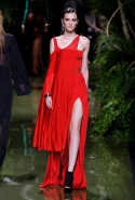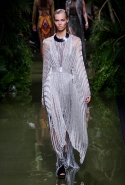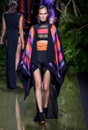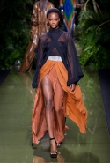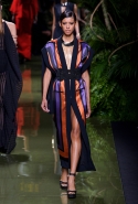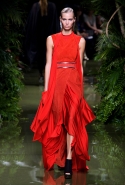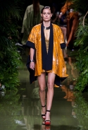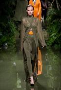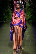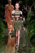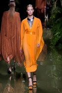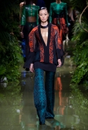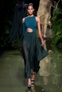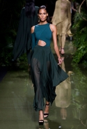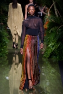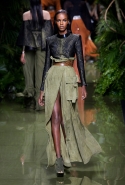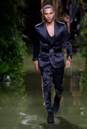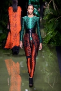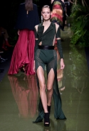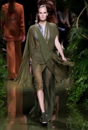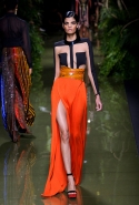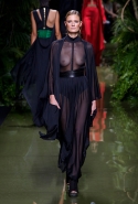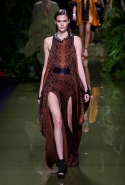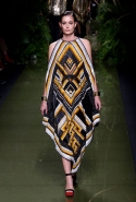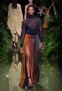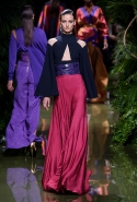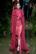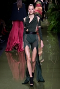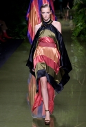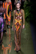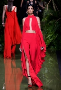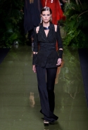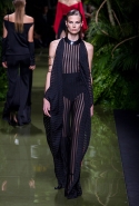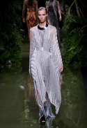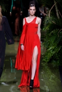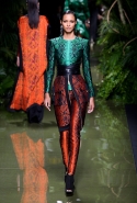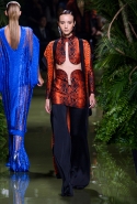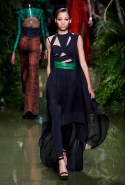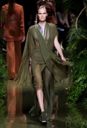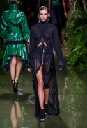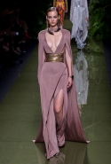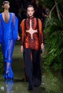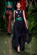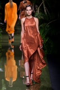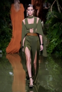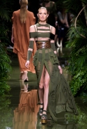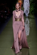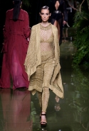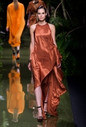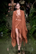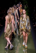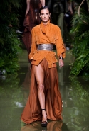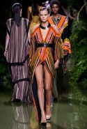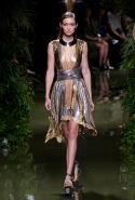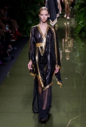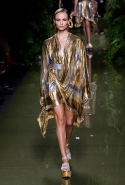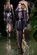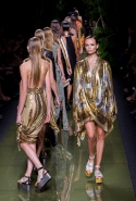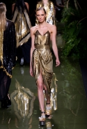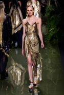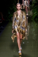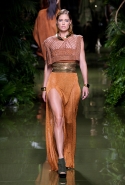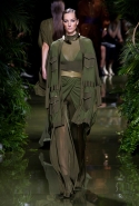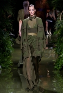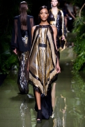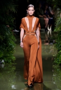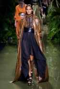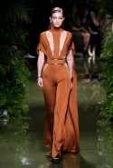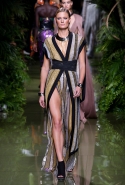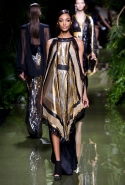 Наташа Поли открыла показ в свободном платье с вырезами на груди. Джордан Данн вышла в золотом одеянии а-ля супруга римского патриция. Другие модели выходили в сложносконструированных многослойных и многоцветных платьях с вырезами на груди, на плечах или на спине или в золотисто-кофейных драпировках. Все это — полная противоположность тем доспехам, которые мы привыкли видеть у Balmain. «Золото и богатство» — название коллекции идеально описывало ее содержание.