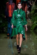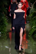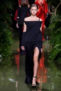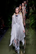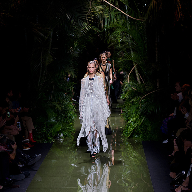 Зал, украшенный тропическими растениями, был наполнен журчанием ручьев и криками экзотических птиц. Все это напоминало леса Амазонии, а в первом ряду восседали хозяйки этих джунглей — Ким, Кортни и Крис Дженнер, а также их главный проводник в мире моды Карин Ройтфельд. Почти все модели были «приближенными императрицы», а именно: Джиджи Хадид, Хэйли Болдуин, Алессандра Амброзио и Жозефин Скривер. Последняя пришла на показ в свитшоте Vetements c небезызвестной картинкой из кинофильма «Титаник».
