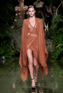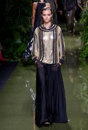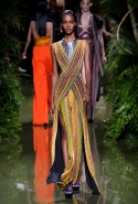 Наташа Поли открыла показ в свободном платье с вырезами на груди. Джордан Данн вышла в золотом одеянии а-ля супруга римского патриция. Другие модели выходили в сложносконструированных многослойных и многоцветных платьях с вырезами на груди, на плечах или на спине или в золотисто-кофейных драпировках. Все это — полная противоположность тем доспехам, которые мы привыкли видеть у Balmain. «Золото и богатство» — название коллекции идеально описывало ее содержание.