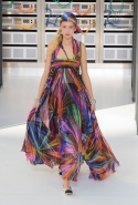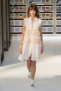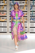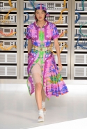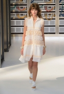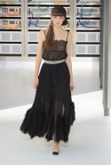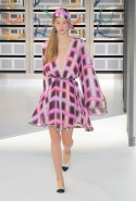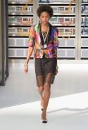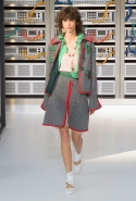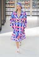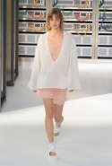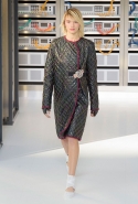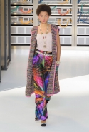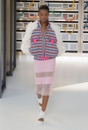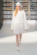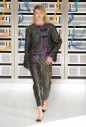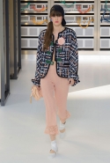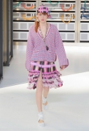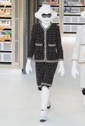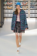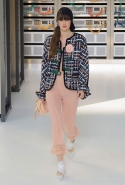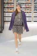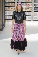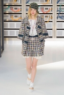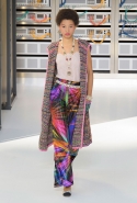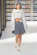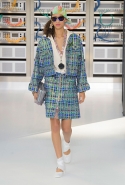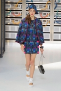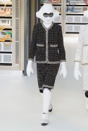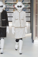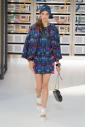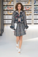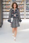 Показ открыла модель в VR-шлеме, футуристичной обуви и в знаковом твидовом костюме. Лагерфельд обозначил направление к технологиям и современности, но далее высокой технологичности не последовало: читались отсылки сразу с нескольким декадам ХХ века, в особенности – к временам Мадмуазель Шанель и к 1980-м.