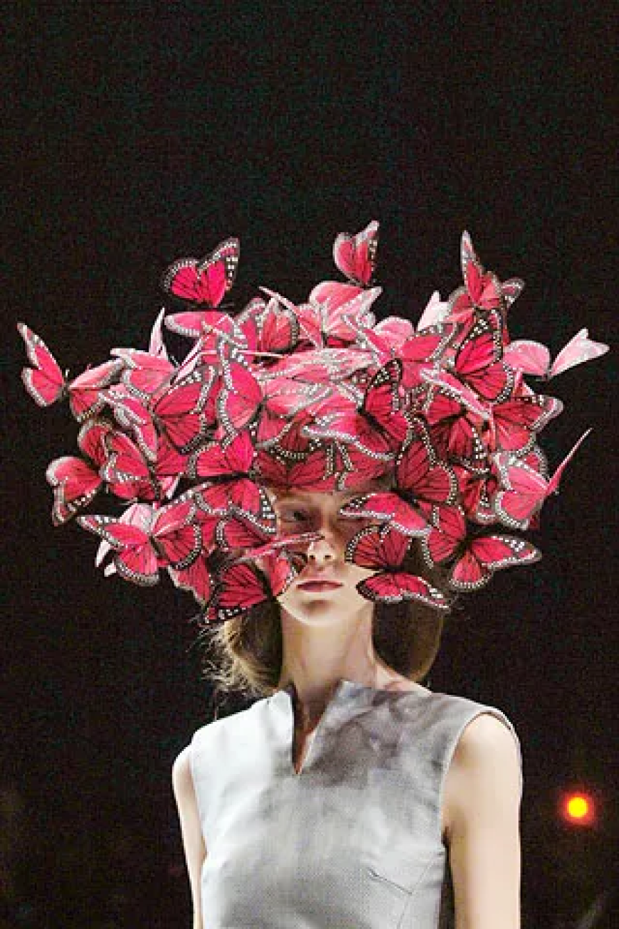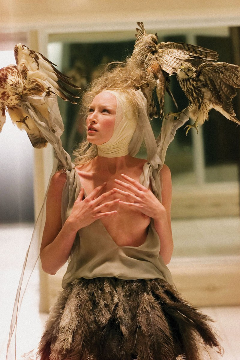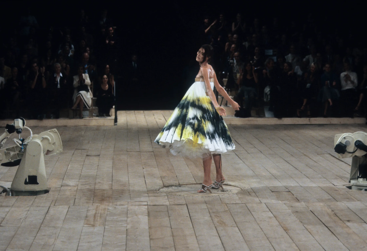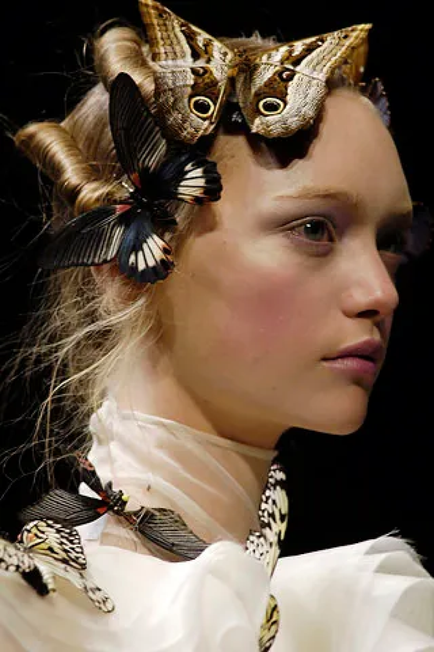 Одно из самых зрелищных шоу Маккуина и всей индустрии (во всяком случае, для редакции BURO.), для которого дизайнер арендовал заброшенный автобусный парк на Гатлиф-роуд. Показ намеренно задерживали, чтобы прибывшие могли повнимательнее рассмотреть себя в стеклянный куб. Позже свет в нем зажегся — внутри оказались заперты модели: одни — в бинтах, другие — с виадуками на головах. Зрители наблюдали за безумством происходящего через «окно». В финале показа ящик вдруг открылся — из него вылетели мотыльки, и гости увидели обнаженную женщину. Это была писательница Мишель Олли в маске с дыхательной трубкой — будто со снимка Sanitarium (1983) американского фотографа Джоэла-Питера Уиткина. В этот вечер Маккуин много и честно говорил не только о природе, но и о принятии себя. А еще о том, что на самом деле происходит между ним и миром моды.