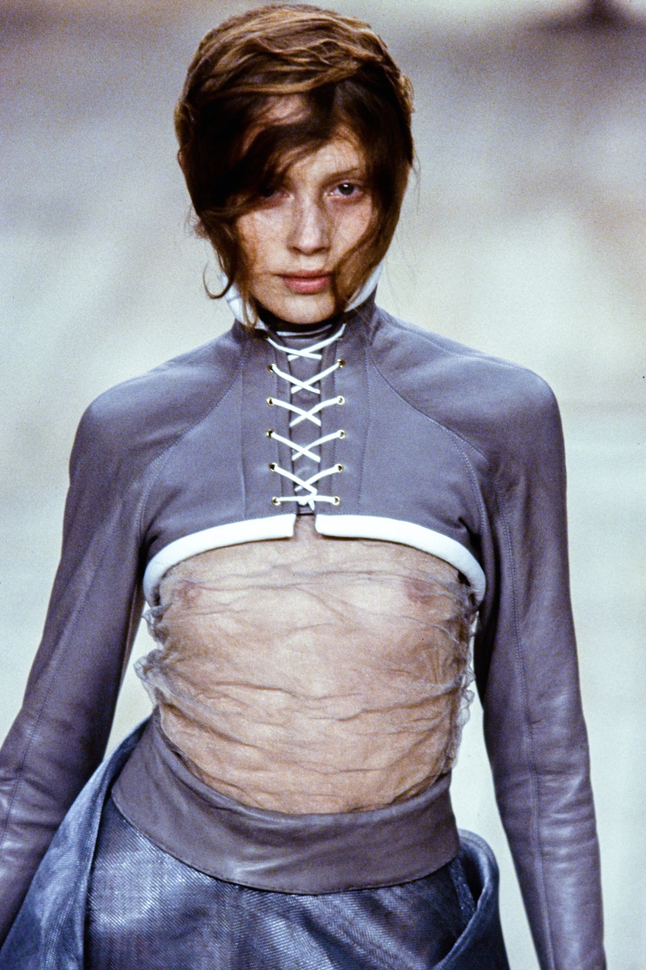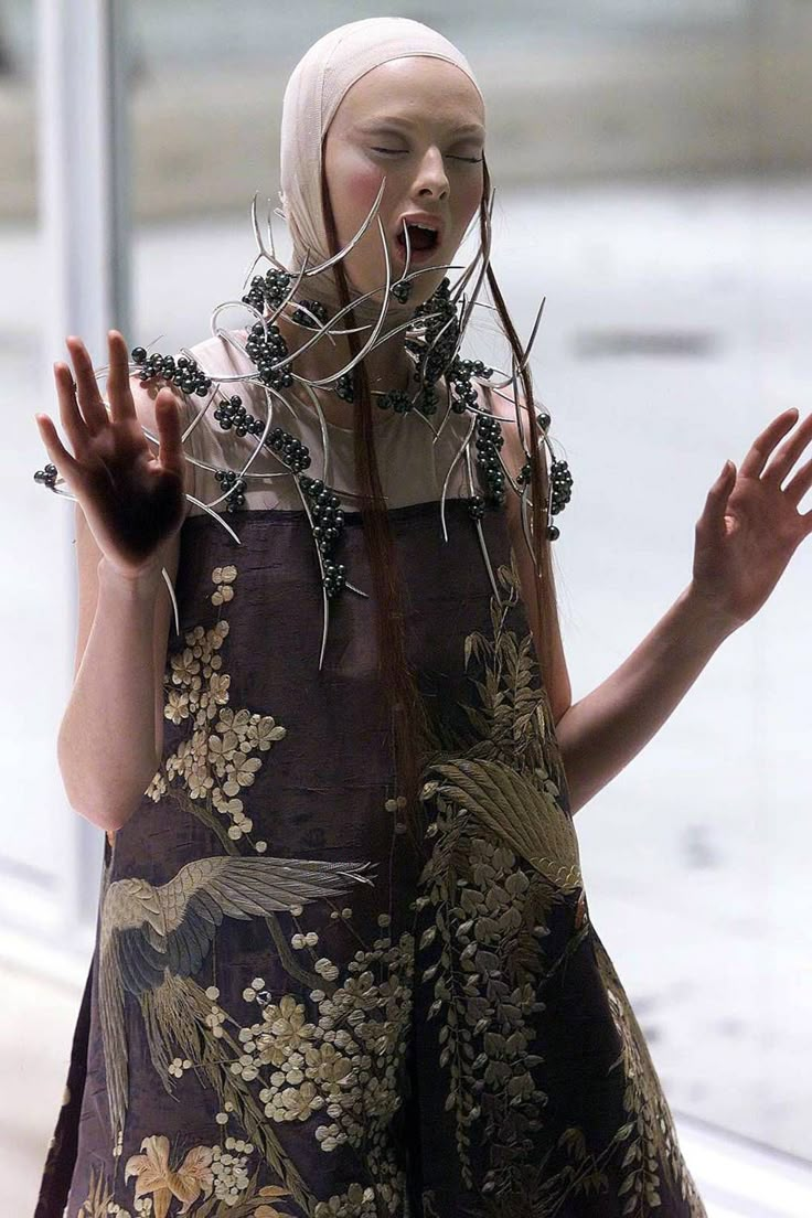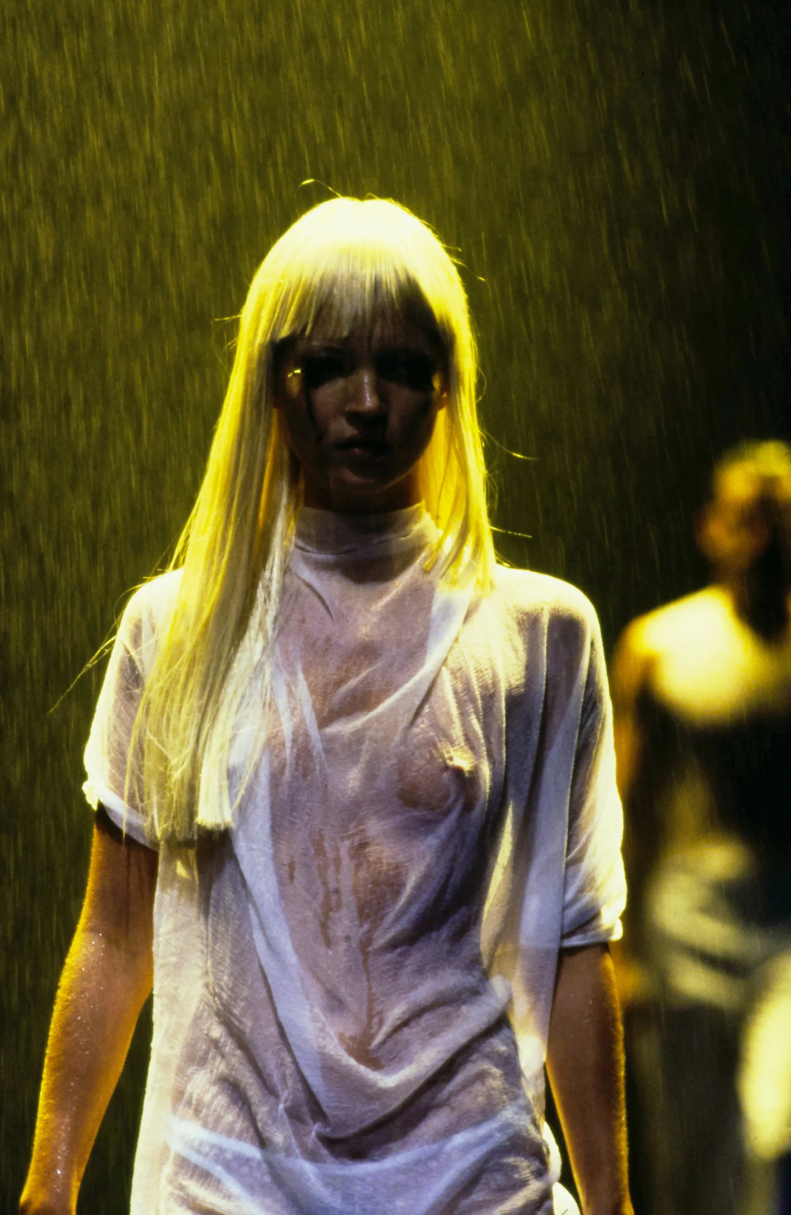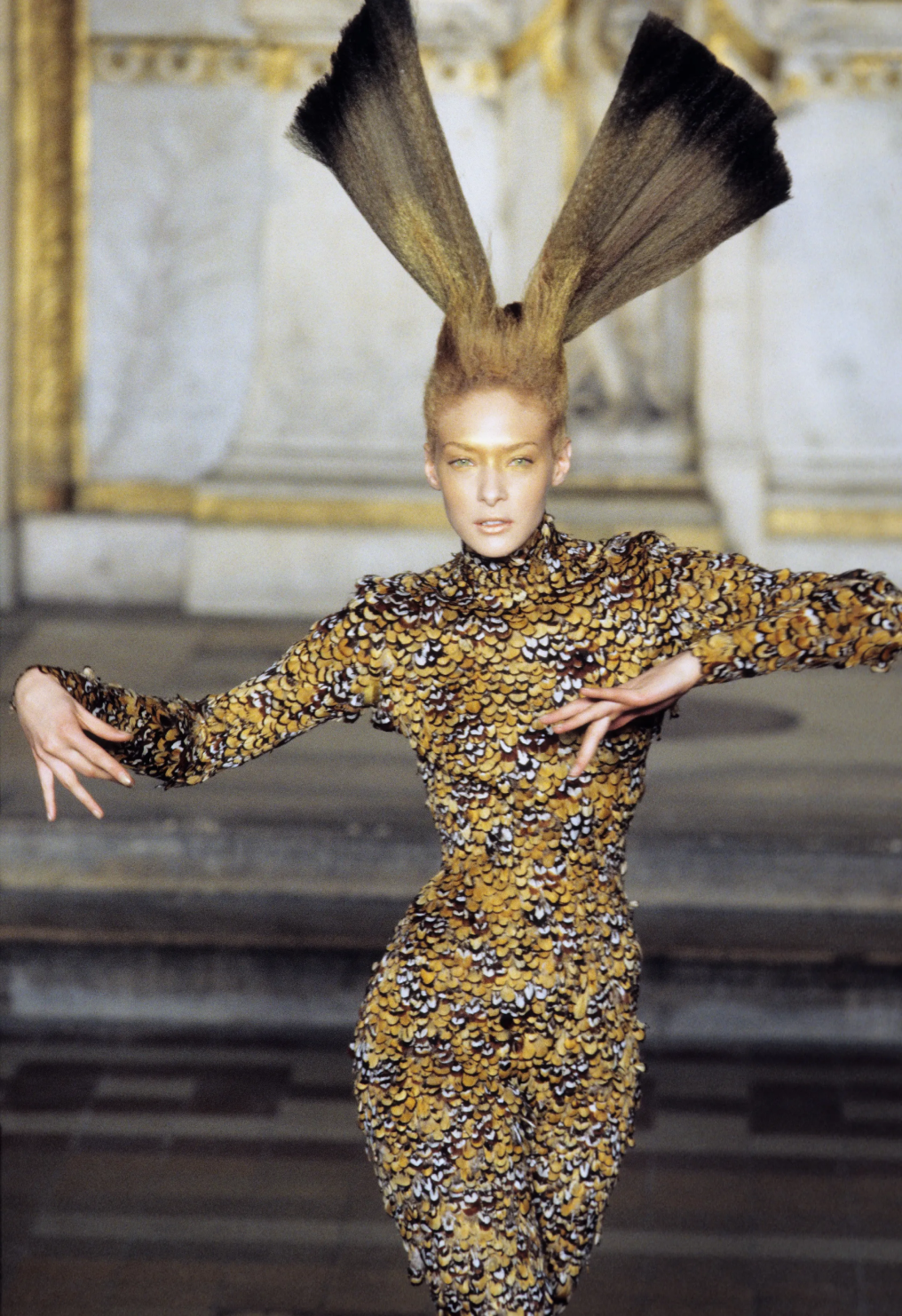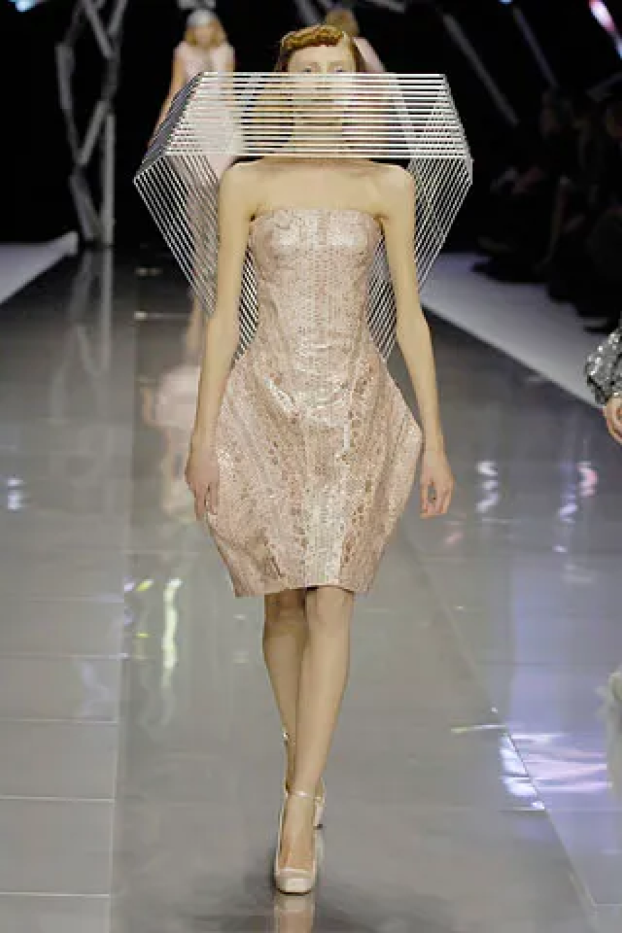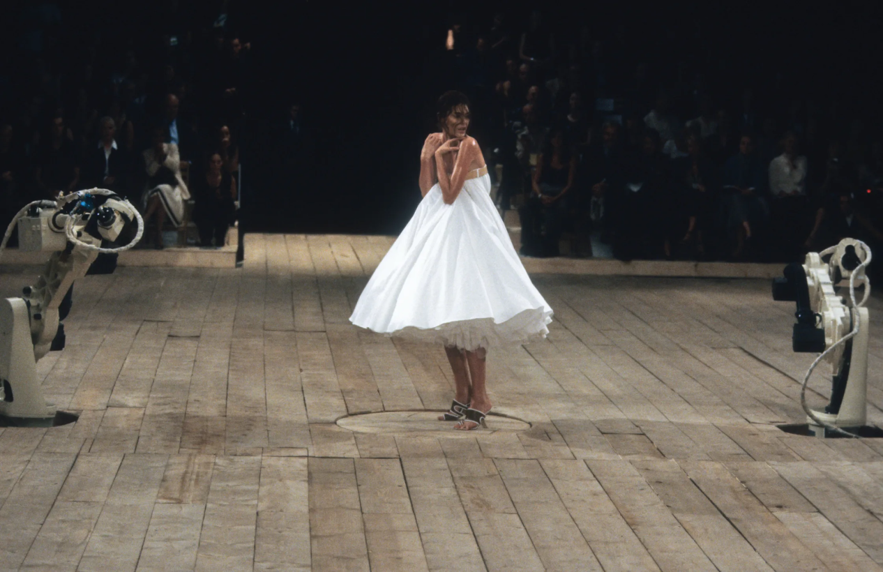 Технологичный трюк с окраской кипенно-белого платья с Шалом Харлоу в главной роли пару лет назад пытались повторить в Coperni (только с Белой Хадид) — и сразу же откатили нас в 1999 год. Тот самый, когда Ли показал коллекцию «№ 13», а вместе с ней — квинтэссенцию уходящего десятилетия, в котором машины противостояли человеку и наоборот (отсюда — много ручного труда). Именно на этом шоу Маккуин выведет на подиум паралимпийскую чемпионку Эйми Маллинз (тогда дайверсити еще не было на повестке дня) и придумает специально для нее деревянные протезы. Причем такие, что никто из присутствующих о них не догадается.