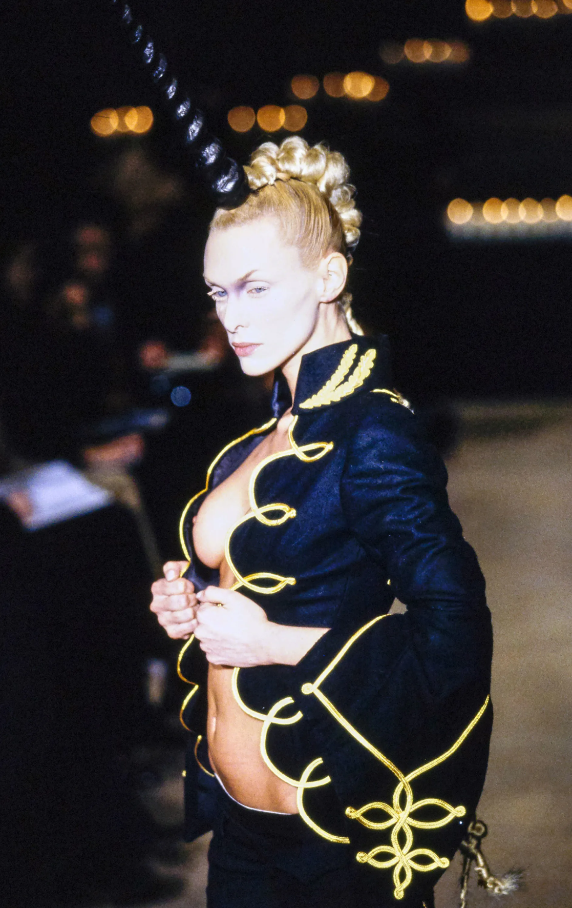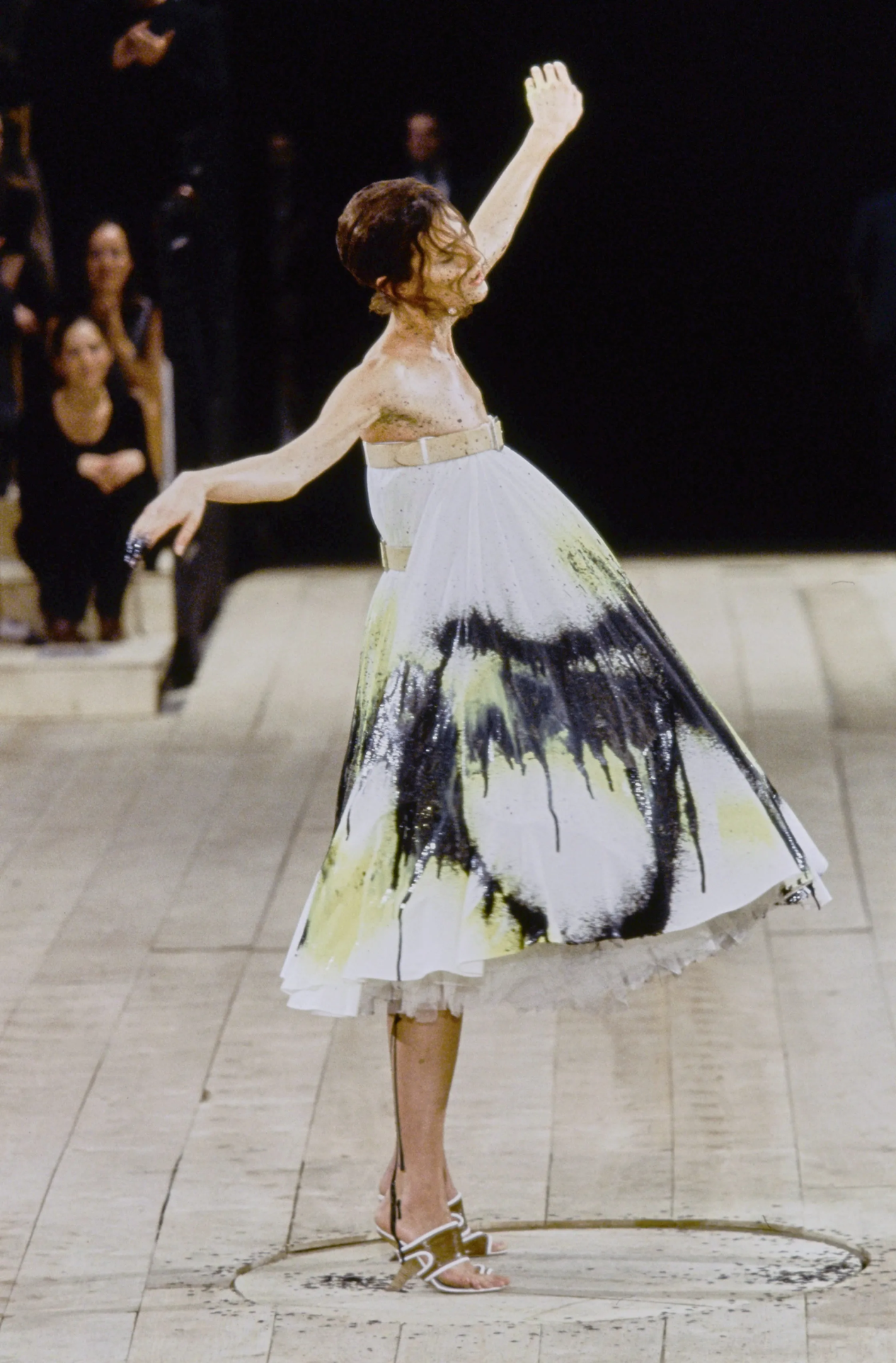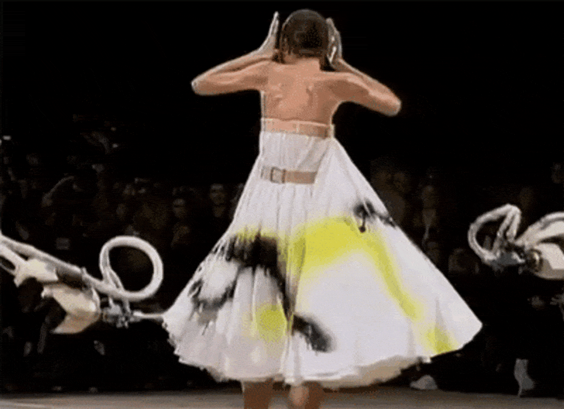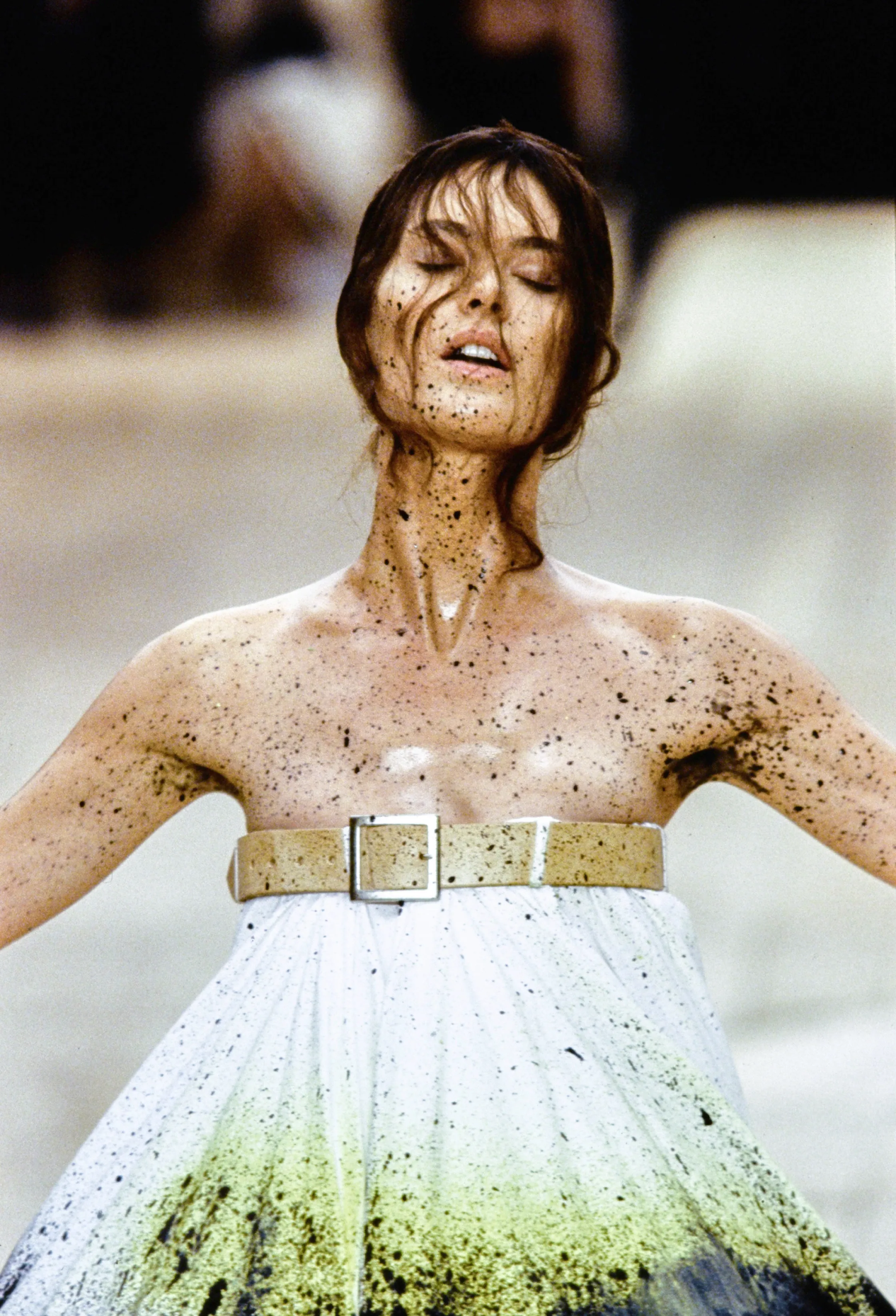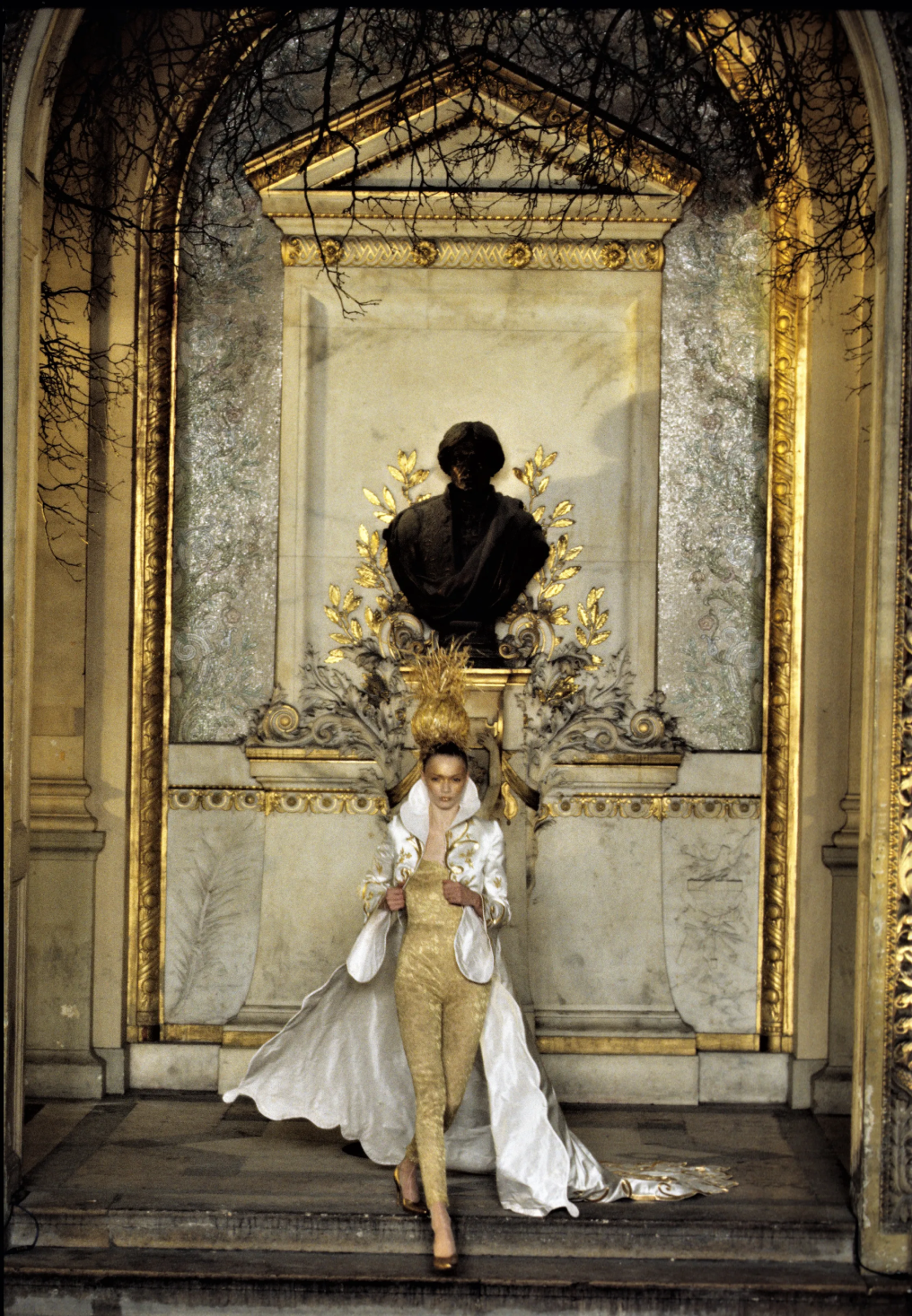 Технологичный трюк с окраской кипенно-белого платья с Шалом Харлоу в главной роли пару лет назад пытались повторить в Coperni (только с Белой Хадид) — и сразу же откатили нас в 1999 год. Тот самый, когда Ли показал коллекцию «№ 13», а вместе с ней — квинтэссенцию уходящего десятилетия, в котором машины противостояли человеку и наоборот (отсюда — много ручного труда). Именно на этом шоу Маккуин выведет на подиум паралимпийскую чемпионку Эйми Маллинз (тогда дайверсити еще не было на повестке дня) и придумает специально для нее деревянные протезы. Причем такие, что никто из присутствующих о них не догадается.