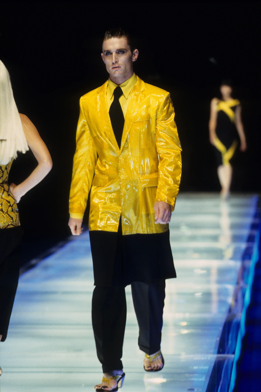 Изначально получившую название «Золотой дождь» (в финале он и правда был золотым), коллекцию весна-лето 1998 быстро переименовали в безымянную (не всем пришелся по душе Golden Shower). Маккуин выводит на подиум переписанный на новый лад офискор, питоновые юбки, желтые пиджаки-дождевики и делает красивый реверанс костюму Лилу авторства Готье из «Пятого элемента», который увидел свет годом ранее.