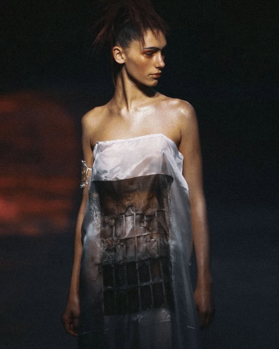 В числе образов-фаворитов отметим сразу два — и оба для Эрин О’Коннор. Сперва модель «сходила с ума» в платье, полностью выполненном из ракушек бритвенных моллюсков (во время шоу она их срывала, и по ее рукам текла кровь), а в конце прошлась в том, что собрали из страусиных перьев и предметных стекол для микроскопа, окрашенных в красный.