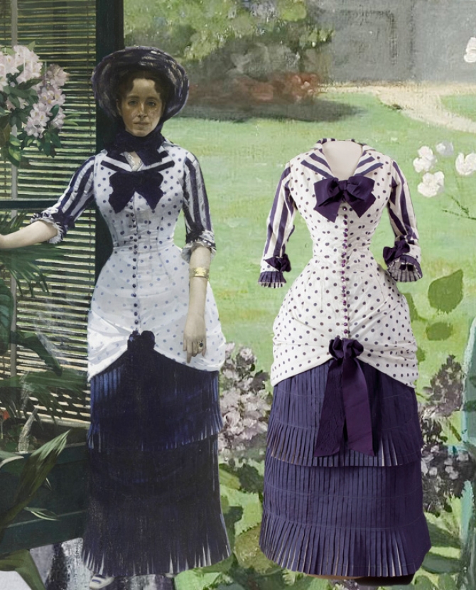 Оставим в стороне особую магию импрессионистской живописи, красоту и неповторимую "интимность" представленных батистовых и бархатных платьев, хрупких шляпок из итальянской соломки и шелковых чулок (наблюдая эти экспонаты, как не представить себе реальных женщин, высоких и статных, хрупких и миниатюрных, которые их носили), вернемся к вопросу: так о чем же все-таки эта выставка? По свидетельству куратора и одного из ее вдохновителей, специалиста чикагского The Art Institute Глории Грум, на мысль организовать подобную экспозицию ее вдохновило осознание того, что импрессионисты были восприимчивы к моде как ни одна другая художественная группа до них. "Дега, Моне, Мане находились под впечатлением от современной модной индустрии — как и от других новых явлений общественной жизни, набиравших силу в ту эпоху (промышленности, железных дорог, сферы развлечений)", — подчеркивает Грум. Собственно, именно во времена импрессионистов начала складываться та совокупность явлений, под которыми мы и сегодня понимаем "модную индустрию" — более массовое производство модного платья, ставшего доступным для буржуазии, тогдашнего среднего класса, и первые универмаги, в которых его можно было приобрести. Например, в магазинах, подобных парижскому Le Bon Marche, во второй половине XIX века можно было купить не только ткани и фурнитуру, для того чтобы сшить туалет на заказ, но и своеобразный "полуфабрикат" платья — собственно сам туалет определенного фасона, но без декоративных элементов, который потом покупательница украшала по собственному вкусу бантами, кружевами и другими деталями.